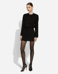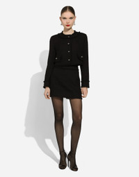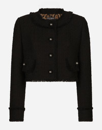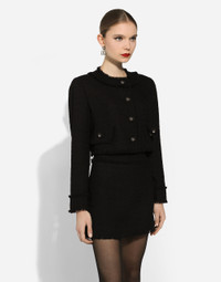 The DNA collection is distinguished by timeless shapes, bringing together three concepts: Sicilian flair, tailoring and sensuality. Nero Sicilia black and optical white predominate and pair with colors that catapult us onto the island of Sicily and make us dream. The designers channel the timeless wardrobe made up of creations that are instantly unmistakable in their simplicity, presenting us with sophisticated beauty loaded with meaning and symbolism that transcends fashion. Short raschel tweed jacket: • Black • Round neck • Long sleeves • Leopard-print stretch satin lining • Canneté-covered button fastenings and DG logo • The piece measures 40.5 cm from the center back on a size IT 40 • The model is 175 cm tall and wears a size IT 40 • Made in Italy External composition: 93% Wool 7% Polyamide Internal composition: 97% Polyester 3% Spandex
