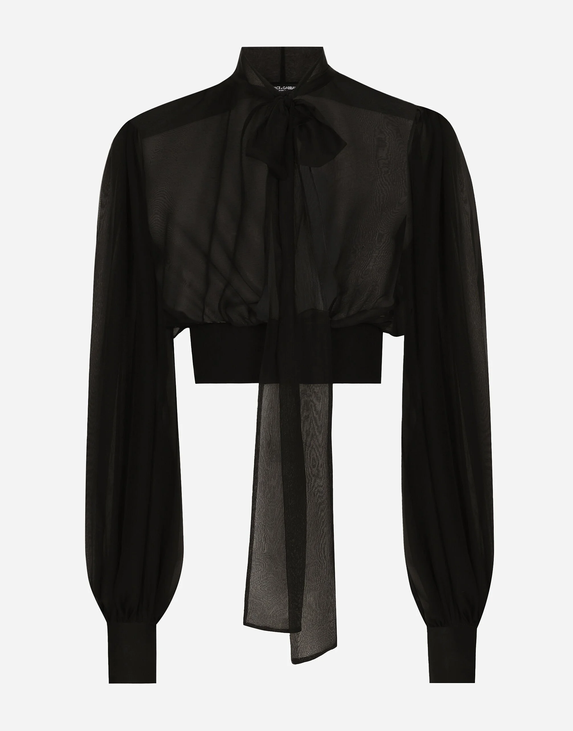 Menswear and womenswear mix and mingle, influencing one another and creating tailoring that embraces endless nuances, from the boldest to the most sophisticated, to define the rules of eternally classy femininity. A monochrome retelling in Nero Sicilia black, embellished by golden touches and rhinestones, adorning clean lines and incorporating stylish fabrics such as velvet, chiffon, lace, organza, and unique mesh details, the expression of authentic beauty for dresses, shirts and accessories. Short silk chiffon pussy-bow blouse: • Black • Round neck with scarf that can be tied into a bow • Long sleeves • Shirt-style cuffs • Unlined • Pussy-bow fastening on the front and buttons on the waist • The piece measures 45 cm from the center back on a size IT 40 • The model is 175 cm tall and wears a size IT 40 • Made in Italy External composition: 100% Silk