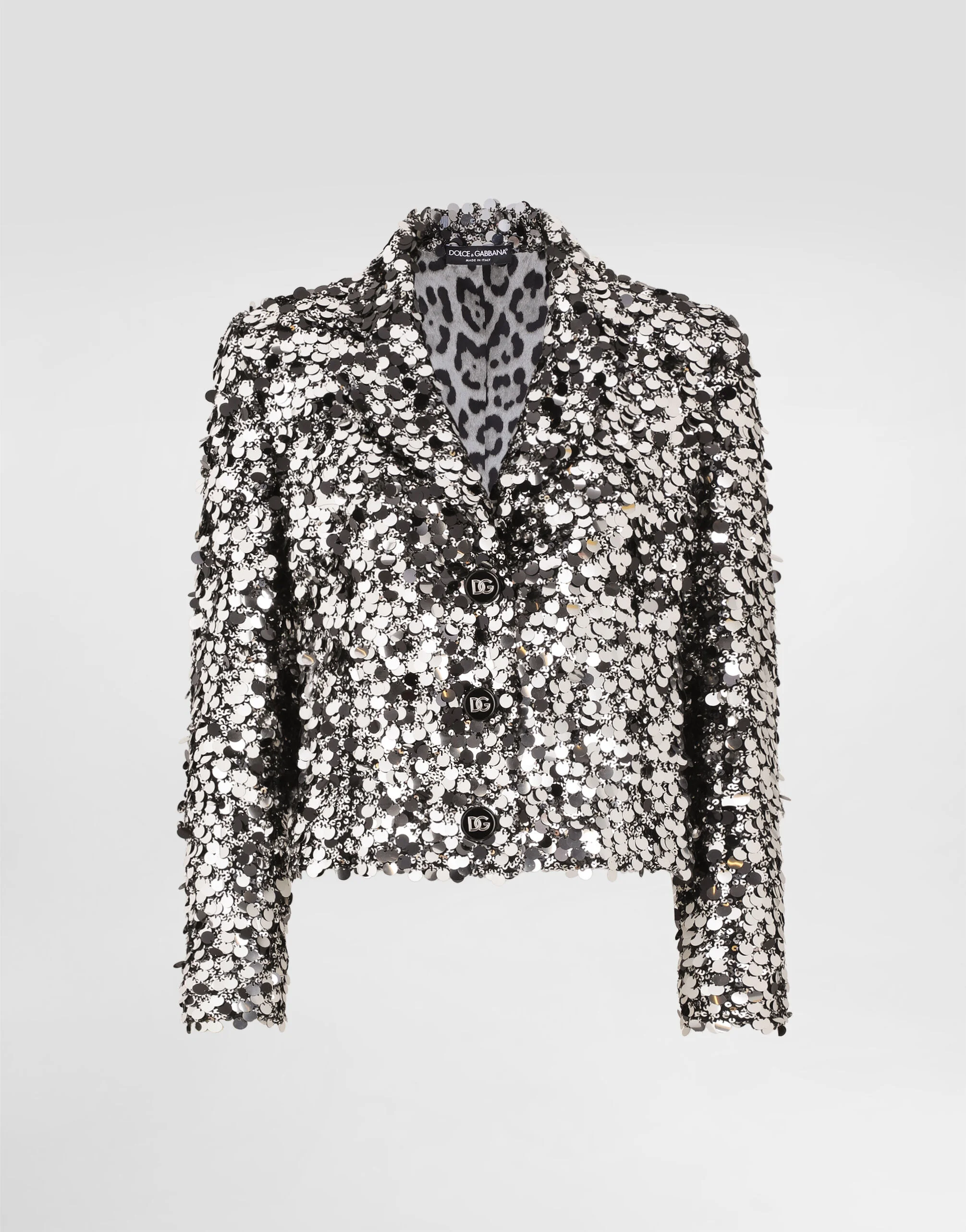 The Everyday Women's Collection reimagines contemporary daily wear with Dolce&Gabbana's signature style codes. Iconic fabrics mix with standout details like embroidered flowers, crystals, and jewel buttons, infusing elegance into every look. Gray animal print accented with green and purple, hyper-geometric jewelry, voluminous shapes and transparencies add unique touches. Men's tweed is reinvented with graphic twists, creating distinctive pieces that reflect refined sensuality. Short single-breasted jacket with sequin embellishment: • Silver • Notched lapels • Long sleeves • Leopard-print silk satin lining • DG-branded button fastenings • The piece measures 53 cm from the center back on a size IT 40 • The model is 175 cm tall and wears a size IT 40 • Made in Italy External composition: 95% Polyester 05% Spandex Internal composition: 100% Silk