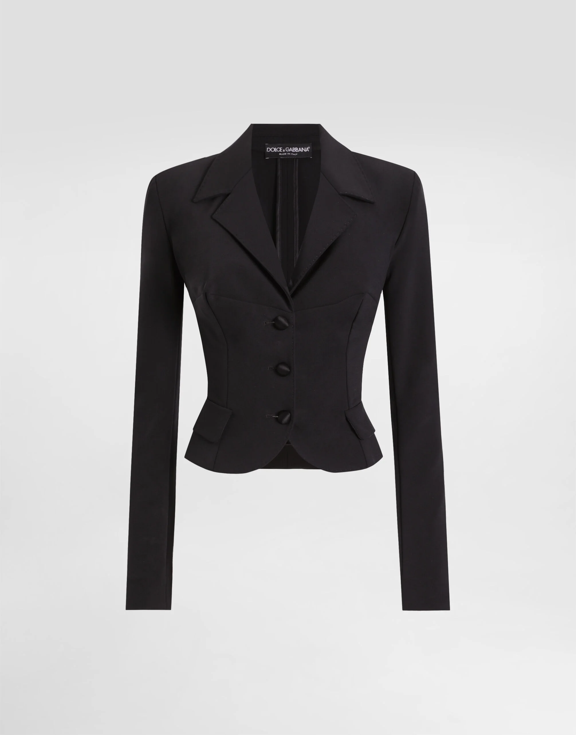 The Spring/Summer 2025 Women’s Collection is celebrating Italian beauty through bold and charismatic femininity. The 50s-inspired lingerie is the star, intermingling with fitted dresses, corsets and oversize trench coats. The iconic jackets have been updated with cropped cuts and modern inserts, while the floral prints add a romantic edge. The eveningwear shines with light fabrics and crystals, accompanied by look-defining accessories, from iconic bags to the cross earrings. Short single-breasted technical cady jacket: • Black • Notched lapels • Long sleeves • Form fitting • Boning on sides • Faux pockets • Unlined • Button fastenings • The piece measures 49 cm from the center back on a size IT 40 • The model is 175 cm tall and wears a size IT 40 • Made in Italy External composition: 90% Polyamide 10% Spandex