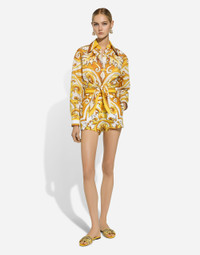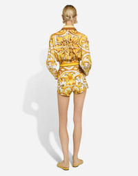 The Majolica, a symbol of Italian craftsmanship, comes in lemon yellow for the FW24/25 Girl’s Collection. This vibrant hue, brightened up by pure white, evokes summer light dancing on the quintessential Sicilian homes that look out to the sea. Evocative color detailing that adds a bold edge to iconic accessories and pieces that are extraordinarily feminine and vibrant. A tribute to the majolica art that, once again, enhances Dolce&Gabbana aesthetic rules. Cotton poplin shorts with majolica print: • White and Yellow • Dolce high waist • Slant pockets • Inner leg: 7.5 cm • Hem: 34 cm • Front zipper fastening and button • The model is 175 cm tall and wears a size IT 40 • Made in Italy External composition: 100% Cotton