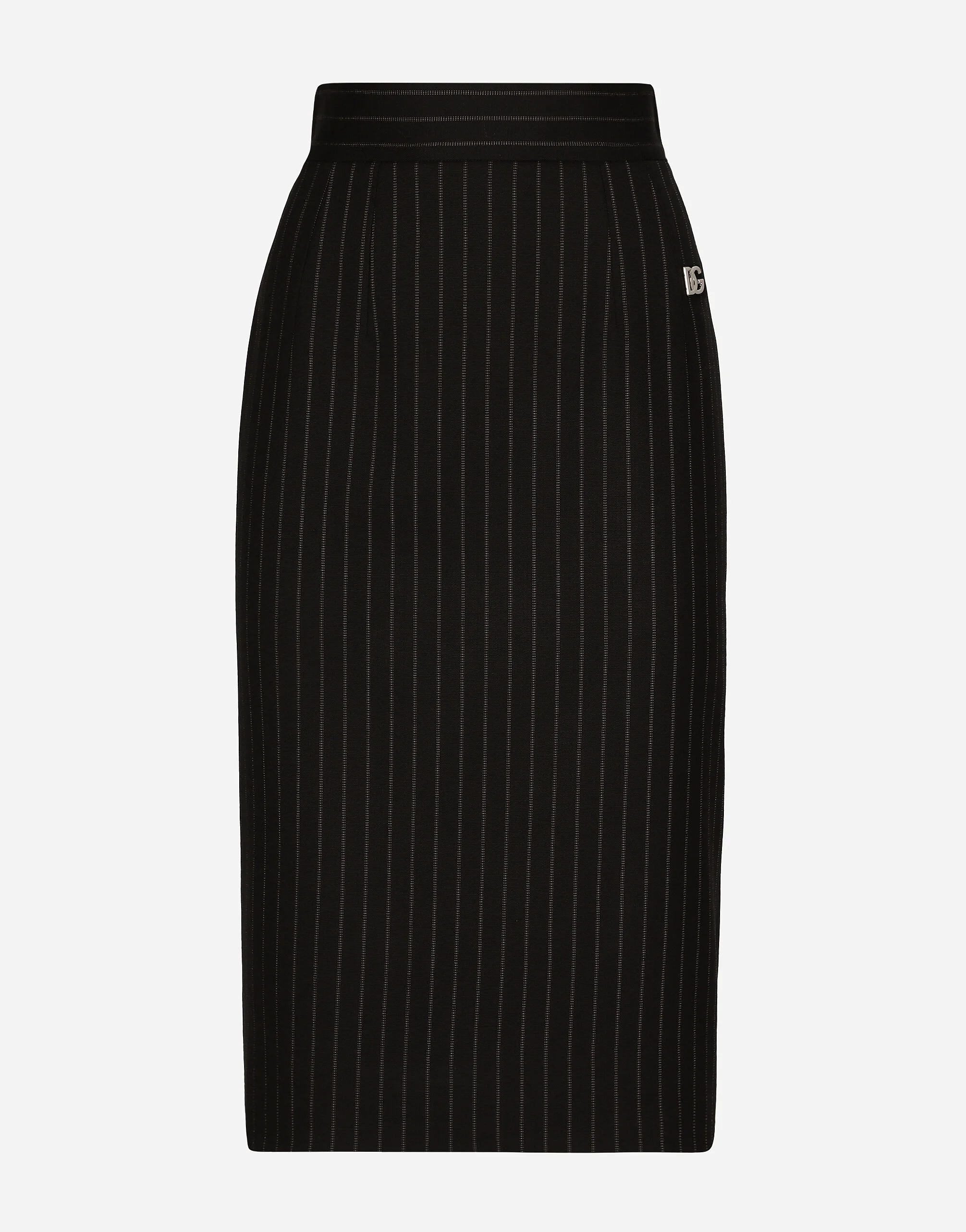 In the Black Sicily Collection, black, the absolute protagonist, becomes sensual black, sheer black, Dolce&Gabbana black. The key concept is “Black on Black”. Playing around with proportions, volumes, layered fabrics and sheer details, this style becomes absolute, bold and sexy. Unique and unmistakable, it is conveyed through the contrasts between glossy and matte fabrics, lines, volumes and special details, thereby expressing a woman’s various personalities and the true identity of Dolce&Gabbana. Short straight-cut pinstripe stretch wool skirt: • Black • High-waisted • Leopard-print stretch silk satin lining • Rear zipper and hook-and-eye fastening • The piece measures 45 cm from the waist down on a size IT 40 • The model is 175 cm tall and wears a size IT 40 • Made in Italy External composition: 96% Virgin Wool 2% Spandex 2% Polyester Internal composition: 93% Silk 7% Spandex