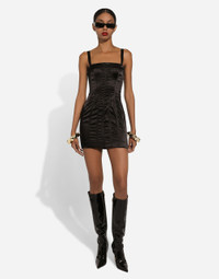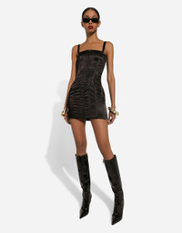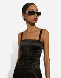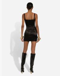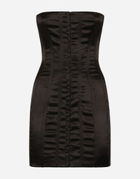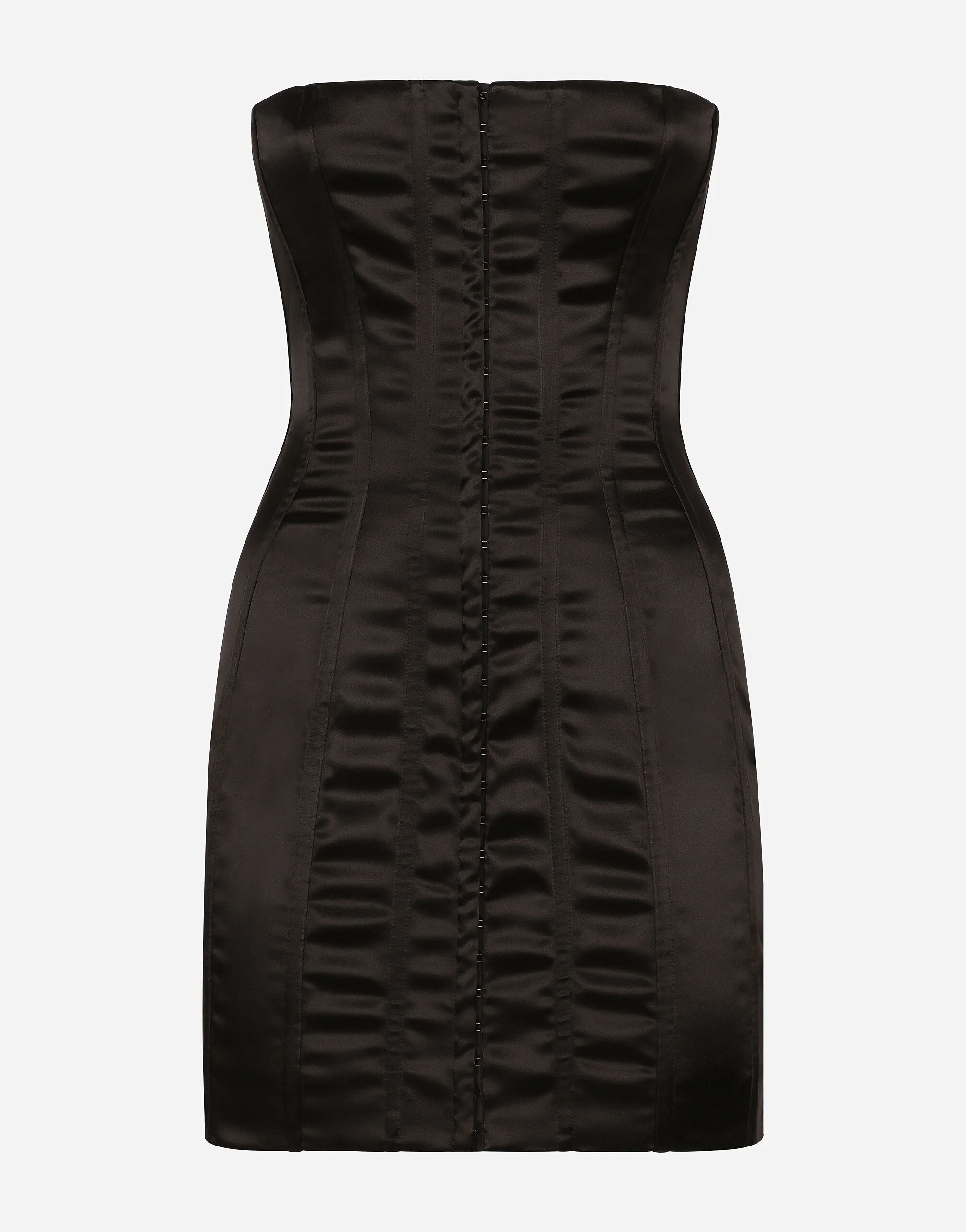 In the Black Sicily Collection, black, the absolute protagonist, becomes sensual black, sheer black, Dolce&Gabbana black. The key concept is “Black on Black”. Playing around with proportions, volumes, layered fabrics and sheer details, this style becomes absolute, bold and sexy. Unique and unmistakable, it is conveyed through the contrasts between glossy and matte fabrics, lines, volumes and special details, thereby expressing a woman’s various personalities and the true identity of Dolce&Gabbana. Short strapless dress in canvassed stretch satin: • Black • Straight neckline • Sleeveless • Hook-and-eye fastening on front • Boned bodice • Form fitting • Stretch silk crepe de chine lining • Invisible zipper and hook-and-eye fastening on the back • The piece measures 45 cm from the waist down on a size IT 40 • The model is 175 cm tall and wears a size IT 40 • Made in Italy External composition: 65% Acetate 29% Polyamide 6% Spandex Internal composition: 91% Silk 9% Spandex