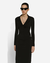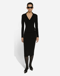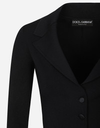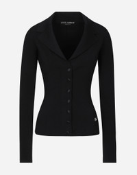 Inspired by 80s fashion photography, the Black Sicily collection masterfully blends masculine and feminine elements, pairing tailored cuts and corset details for the FW 24/25 season. A new vision of the iconic Nero Sicilia black is conveyed through contemporary and sensual looks: jackets and skirts in all-over glen plaid pair with openwork socks, while the 50s-inspired Mun shoes with Eva heel go with the houndstooth Sicily bag featuring crocodile-print leather inserts. Short stretch viscose knit jacket with DG logo: • Black • Notched lapel collar • 14-gauge knit • Compact hand • Form fitting • Unlined • Satin button fastenings • The piece measures 58 cm from the shoulder seam on a size IT 40 • The model is 175 cm tall and wears a size IT 40 • Made in Italy External composition: 71% Viscose 15% Polyester 8% Polyamide 6% Spandex