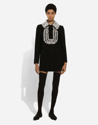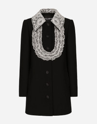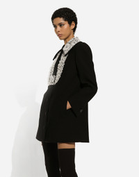 In the “WOMAN SS 24” Collection, the imagery of old Sicily interacts with the masculine, with sensual shapes, lace, nude tones and delicate overlays, to create pieces that move amid clean silhouettes, the elegance of the 1960s, the contrasts of black and white and luxurious textures. The designers are reworking their signature style and their iconic Sicilia black color to convey an aware, seductive and confident Sicilian WOMAN who is imbued with sensuality. Short stretch wool crepe coat with lace details: • Black • Macramé baby collar with lace embroidery • Long sleeves • Sack fit • Welt pockets • Stretch silk satin lining • Button fastenings • The piece measures 79 cm from the center back on a size IT 40 • The model is 175 cm tall and wears a size IT 40 • Made in Italy External composition: 79% Virgin Wool 08% Cotton 07% Viscose 03% Polyamide 02% Polyester 01% Spandex Internal composition: 92% Silk 08% Spandex