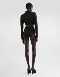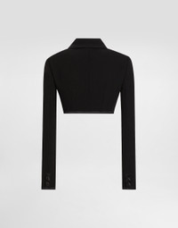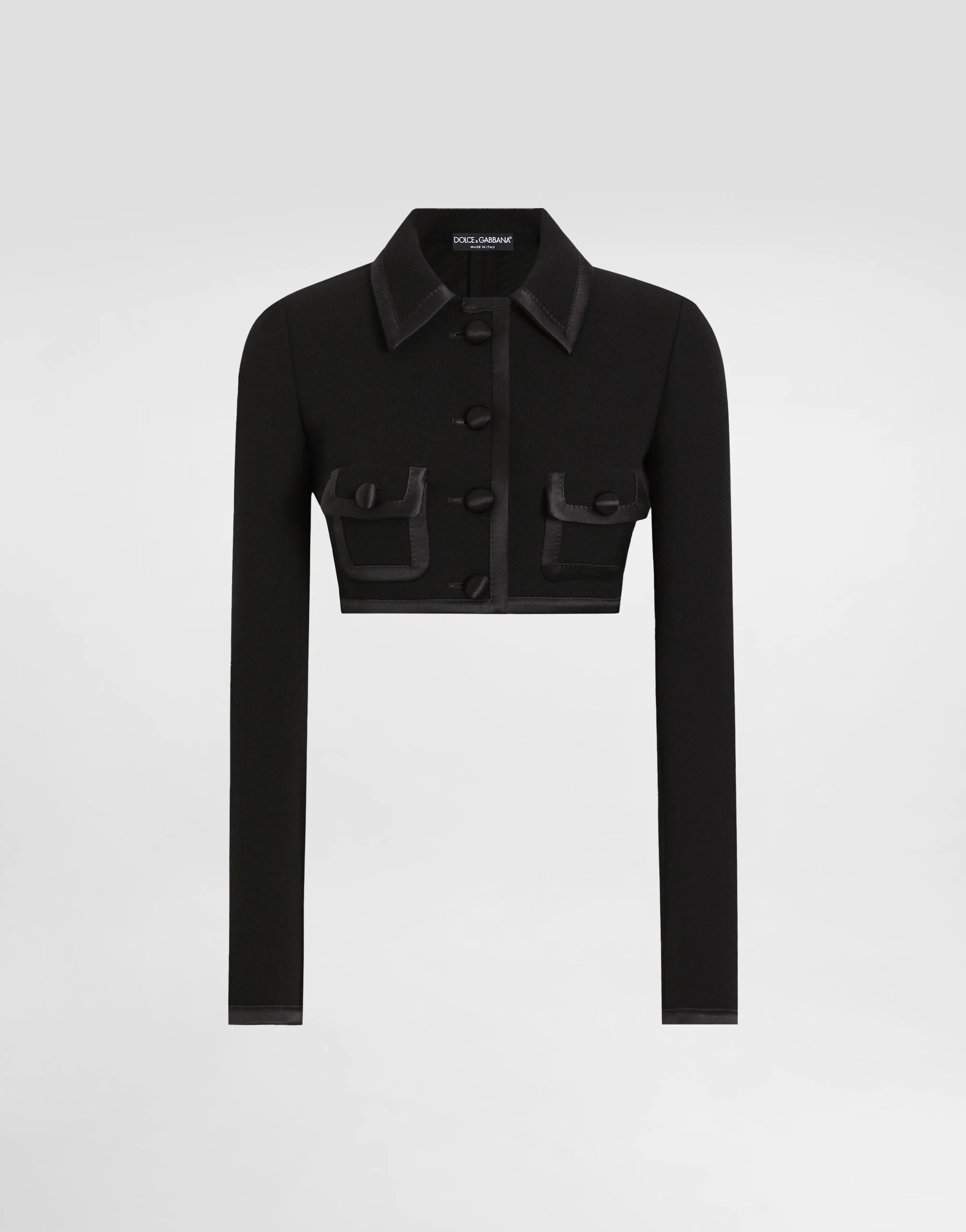 The Spring/Summer 2025 Women’s Collection is celebrating Italian beauty through bold and charismatic femininity. The 50s-inspired lingerie is the star, intermingling with fitted dresses, corsets and oversize trench coats. The iconic jackets have been updated with cropped cuts and modern inserts, while the floral prints add a romantic edge. The eveningwear shines with light fabrics and crystals, accompanied by look-defining accessories, from iconic bags to the cross earrings. Short single-breasted wool crepe jacket with satin piping: • Black • Shirt collar • Long sleeves • Patch pockets • Tulle lining • Satin-covered button fastenings • The piece measures 33.5 cm from the center back on a size IT 40 • The model is 175 cm tall and wears a size IT 40 • Made in Italy External composition: 83% Wool 13% Silk 04% Polyester Internal composition: 90% Polyamide 07% Acetate 03% Silk