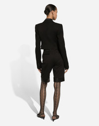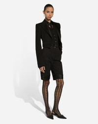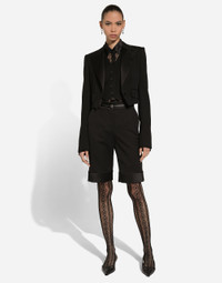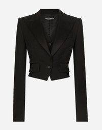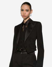 Inspired by 80s fashion photography, the Black Sicily collection masterfully blends masculine and feminine elements, pairing tailored cuts and corset details for the FW 24/25 season. A new vision of the iconic Nero Sicilia black is conveyed through contemporary and sensual looks: jackets and skirts in all-over glen plaid pair with openwork socks, while the 50s-inspired Mun shoes with Eva heel go with the houndstooth Sicily bag featuring crocodile-print leather inserts. Short wool gabardine tuxedo jacket with vest: • Black • Satin peak lapels • Long sleeves • Faux pockets • Silk satin lining • Satin-covered button fastenings • The piece measures 41 cm from the rear collar seam on a size IT 40 • The model is 175 cm tall and wears a size IT 40 • Made in Italy External composition: 83% Virgin Wool 13% Silk 4% Polyester Internal composition: 100% Silk