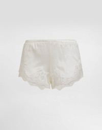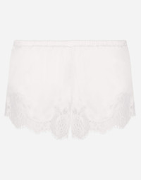 Shorts in stretch silk satin, solid color with detailing in cotton lace. • Leghole embellished with lace •Soft and comfortable covered elastic waistband • Comfortable fit • Made in Italy Care And Details Composition: 80% Silk 3% Polyamide 5% Elastane 12% Cotton