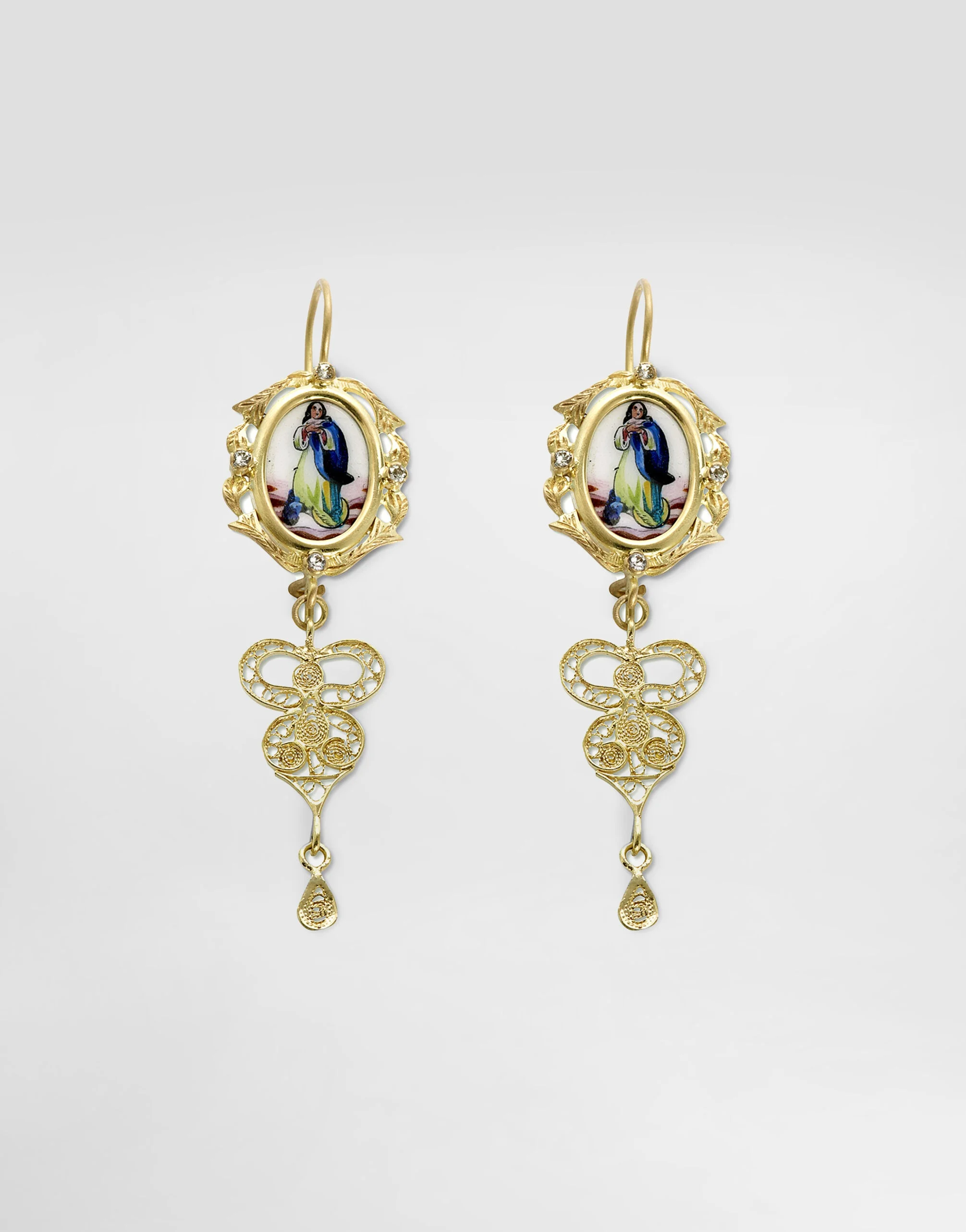 Hook earrings with two elements elegantly arranged from top to bottom in the following order: a hand-painted ceramic miniature from the 19th century depicting various religious figures, enclosed in a golden frame with four colorless sapphires, and a double pendant made of filigree. The logo "DOLCE&GABBANA" is engraved on the back. Technical features: Gold 750/000 Gems: 8 colorless round sapphires Made in Italy Composition: Yellow Gold 750/000