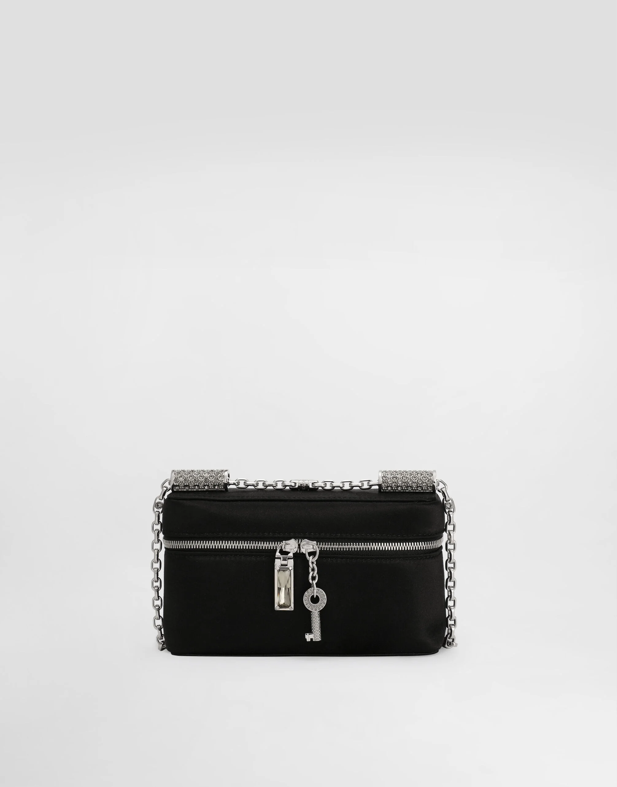 The Sicily bag in satin and pave tubes is an iconic accessory that combines elegance and practicality. Perfect for any occasion, it stands out for its refined workmanship and palladium details. Sicily medium shoulder bag in satin and pave tubes: • Black • Fixed metal chain shoulder strap • Zip closure • Item with logo bag • Palladium plating • Internal customization with logo label • Interior with flat pocket • Item equipped with a logo bag and a pre-assembled box • Measurements: H10 x W17 x D6 cm • Holds keys, card holder, and phone • Made in Italy External Composition: 75% Viscose, 25% Silk Internal Composition: 75% Viscose, 25% Silk