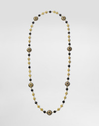 The sautoir consists of faceted round black jades, gold spheres worked in filigree, a very ancient technique still practiced today in Liguria, and a rosette motif shaped in the round and embellished with black sapphires. The chromatic contrast between the yellow of the metal and the black of the gems highlights both the refined elegance of the goldsmithing and the preciousness of the materials. Technical features: Gold 750/000 Length: 80 cm. Gems: 21 black jade beads 266 round black sapphires Made in Italy Composition: Yellow Gold 750/000