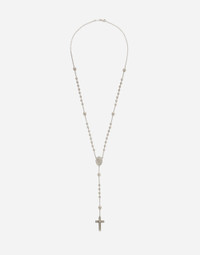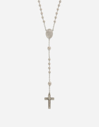 The white gold rosary is made up of thirty-six beads, all in white gold, connected to each other with a handmade chain. A cross with Christ is connected to the main thread by six additional gold beads and a medallion depicting the Madonna. The back of the cross is finely engraved. Technical features: Gold 750/000 Length: 61 cm. Made in Italy Composition: White Gold 750/000