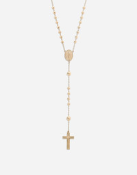 The yellow gold rosary is made up of thirty-six beads, all in yellow gold, connected to each other with a handmade chain. A cross with Christ is connected to the main thread by six additional gold beads and a medallion depicting the Madonna. The back of the cross is finely engraved. Technical features: Gold 750/000 Length: 61 cm. Made in Italy Composition: Yellow Gold 750/000