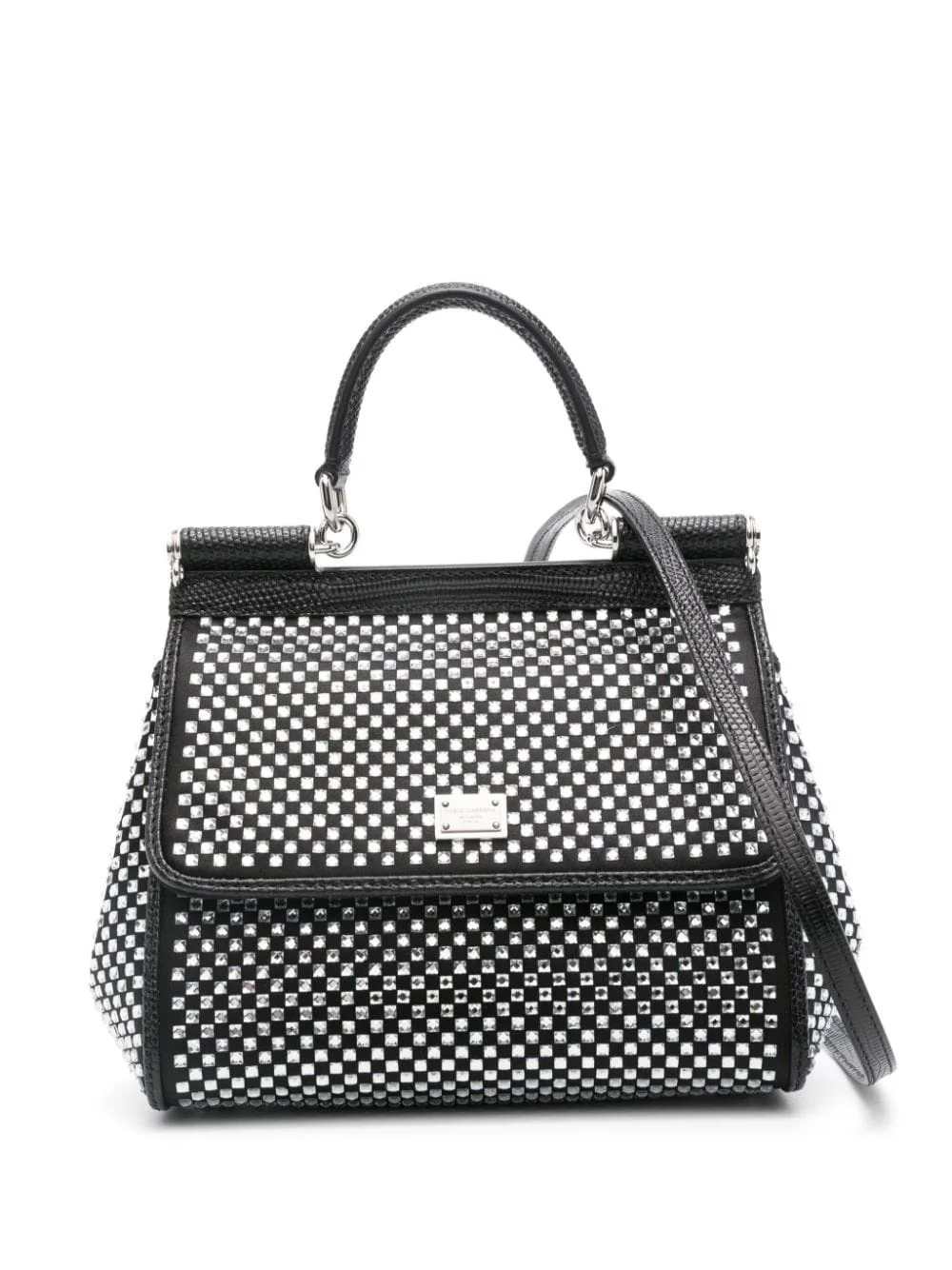 medium Sicily tote bag Highlights - Black - Calf leather - Lizard-skin effect - Crystal embellishment - Adjustable detachable shoulder strap - Single top handle - Logo plaque at the front - Metal feet - Main compartment - Internal patch pocket - Internal card slot - Internal logo plaque - Full lining - Silver-tone hardware - Foldover top with magnetic fastening - This piece comes complete with a protective dust bag. Made in Italy Composition Outer: glass 100%, Viscose 60%, Silk 30%, Calf Leather 10% SIZE & FIT Model measurements Height 5 ft 9 in(1.74 m) Bust/Chest 34.64 in(88 cm) Hips 36.61 in(93 cm) Waist 26.37 in(67 cm) Measurement DEPTH 3.93 in(10 cm) HANDLE 2.36 in(6 cm) HEIGHT 5.9 in(15 cm) STRAP 51.18 in(130 cm) WIDTH 8.26 in(21 cm)