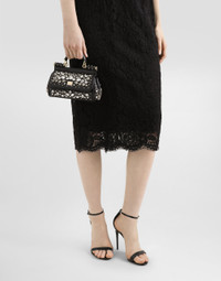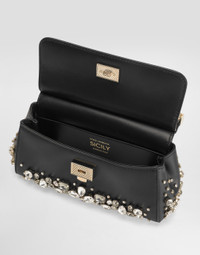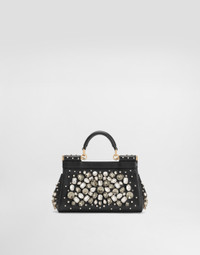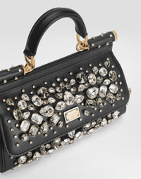The brand icon par excellence, this small Sicily bag comes in plain calfskin. Understated and feminine, it features stone embellishment and the branded tag with two metal plating finishes. Small Sicily bag in plain calfskin: • Black • Front flap with hidden double magnetic fastening • Branded logo tag featuring two metal plating finishes • Top handle and adjustable, detachable strap in plain calfskin • Fabric lining • Item comes with a branded dust bag • Measurements: H13 x W19 x D6 cm • Made in Italy External composition: 100% Calfskin Internal composition: 100% Calfskin