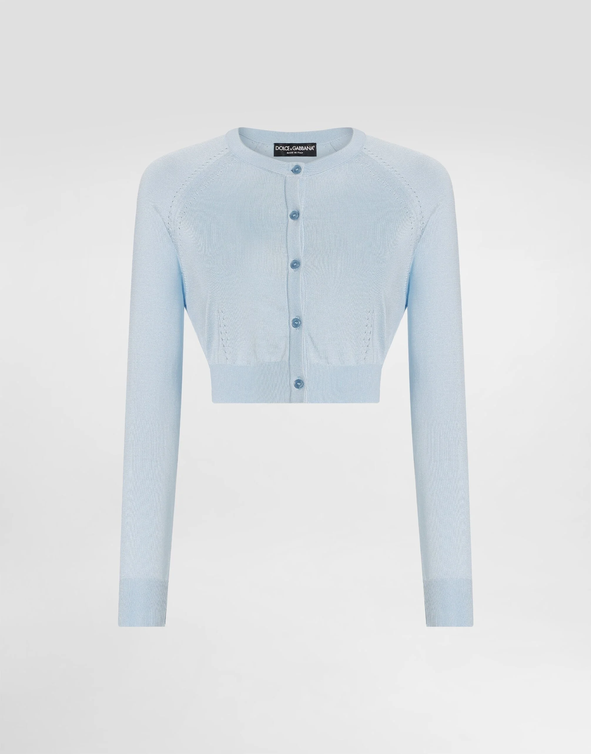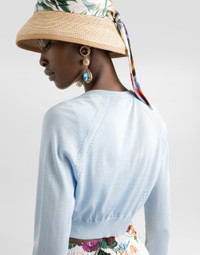 This cardigan is the epitome of sophistication and versatility, perfect for completing any outfit with a touch of elegance. Made in a delicate light blue, its design with buttons and long raglan sleeves makes it suitable for both casual and formal occasions. Silk worked with punches gives a unique and sophisticated texture. Silk cardigan with punches: • Light blue • Crew neck • Long sleeves • Front buttons • Bottom width 36 cm on size 40 IT • The model is 175 cm tall and wears size 40 IT • Made in Italy External Composition: 97% Silk, 3% Polyamide