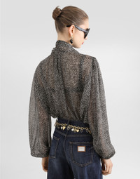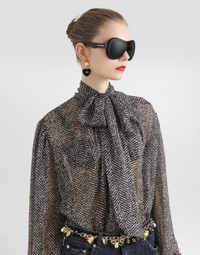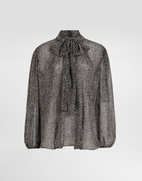 This silk chiffon shirt with chevron print is a versatile and sophisticated piece that is ideal for adding a touch of elegance to any wardrobe. Chevron-print silk chiffon shirt: • Multi-colored • Scarf to tie around the neck • Gathered neckline • Wide sleeves with gathering and elastic hem • Drop in the center back closed by snaps • The model is 175 cm tall and wears size 40 IT • Made in Italy External Composition: 100% Silk