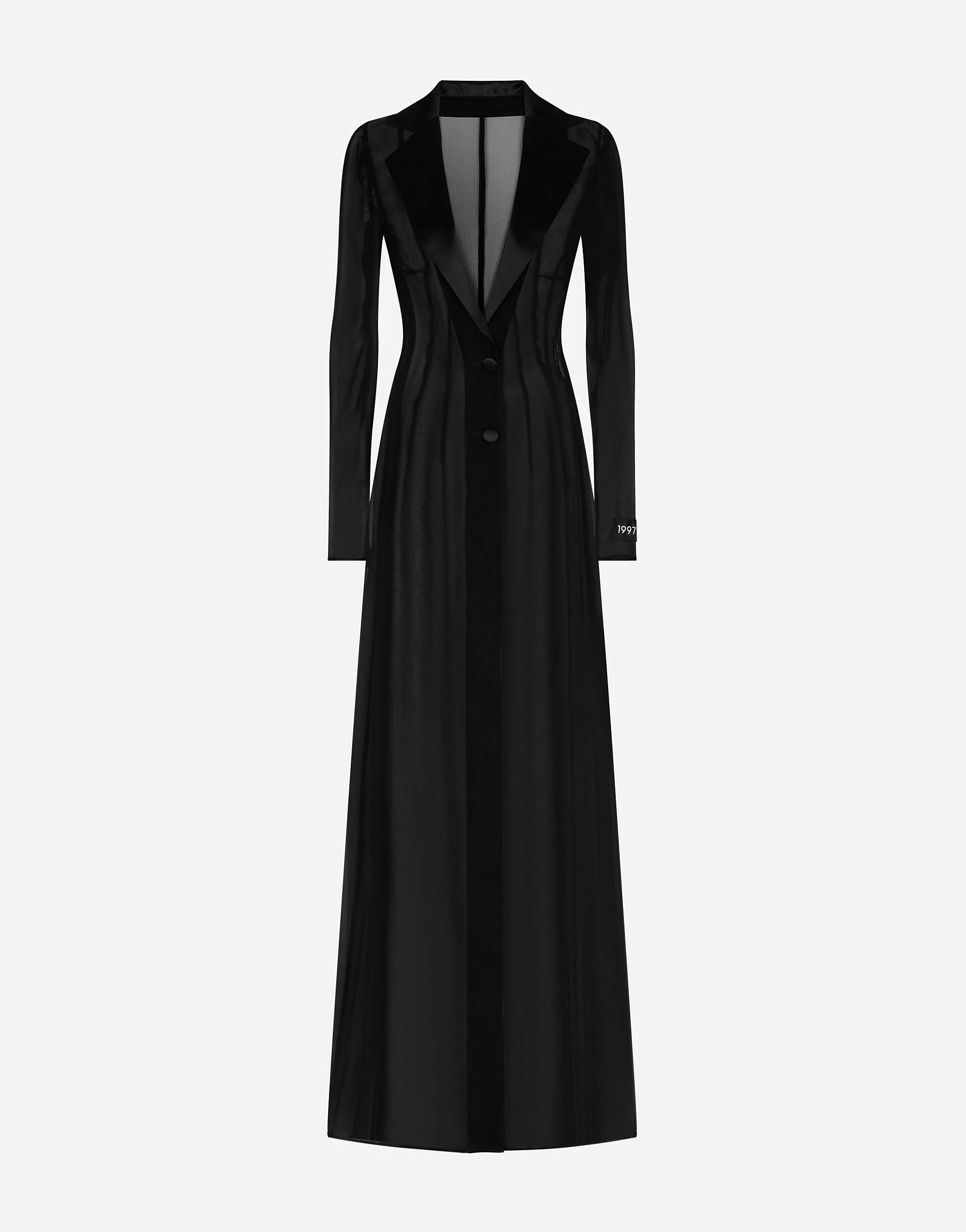 Stretch silk chiffon duster coat with the Re-Edition label: • Black • Satin notched lapels • Long sleeves with zippered cuffs • Slim fit • Unlined • Button fastenings • The piece measures 118 cm from the waist down on a size IT 40 • The model is 175 cm tall and wears a size IT 40 • Made in Italy Care And Details External composition: 93% Silk 7% Spandex