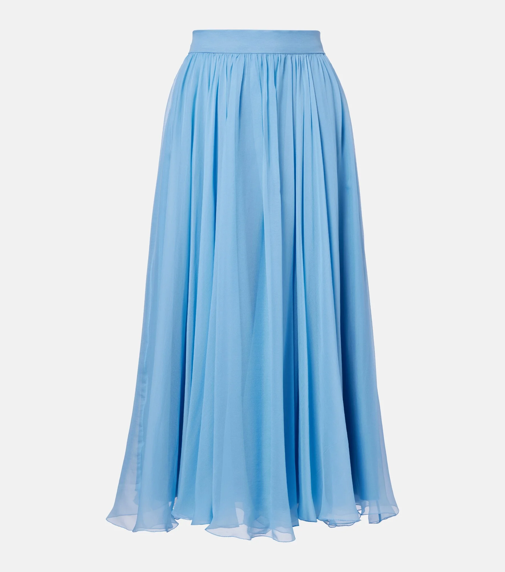 Sicilian culture is on display in Dolce&Gabbana's aesthetic, with bold styles inspired by the brand's Italian heritage. Crafted from fluid, featherweight silk chiffon, this midi skirt is designed with a floating, high-rise silhouette and a stretch silk crepe underskirt. Product Details - Material: 100% silk - Care instructions: dry clean - Made in Italy - Color: blue - Designer color name: Celeste 3 - Lining: 91% silk, 9% elastane - Closure: concealed zipped back - Item number: P01122965 Size & Fit - True to size - Non-stretchy fabric - High-waisted - The model seen in the picture is 178cm-5'10" and wearing a size IT 40