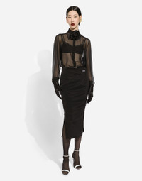 Silk chiffon shirt with satin details: • Black • Satin neck and cuffs • Long sleeves • Regular fit • Unlined • Covered button fastenings • The piece measures 70 cm from the back of the neck on a size IT 40 • The model is 175 cm tall and wears a size IT 40 • Made in Italy Care And Details External composition: 100% Silk