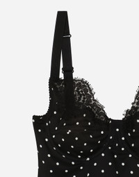The lingerie collection is a mix of elegant and sensual pieces that flaunt timeless and ageless feminine allure, the distinctive, unmistakable feature of the Dolce&Gabbana woman. Stretch silk satin lingerie-style top with polka-dot print and lace detailing: • Black and White • Sweetheart neckline • Satin-lined underwired cups • Adjustable stretch straps • Unlined • The piece measures 60 cm from the strap on an IT size 2 • Made in Italy External composition: 76% Silk 16% Cotton 4% Spandex 4% Polyamide Internal composition: 92% Silk 8% Spandex