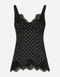 Silk lingerie-style top with polka-dot print and lace detailing