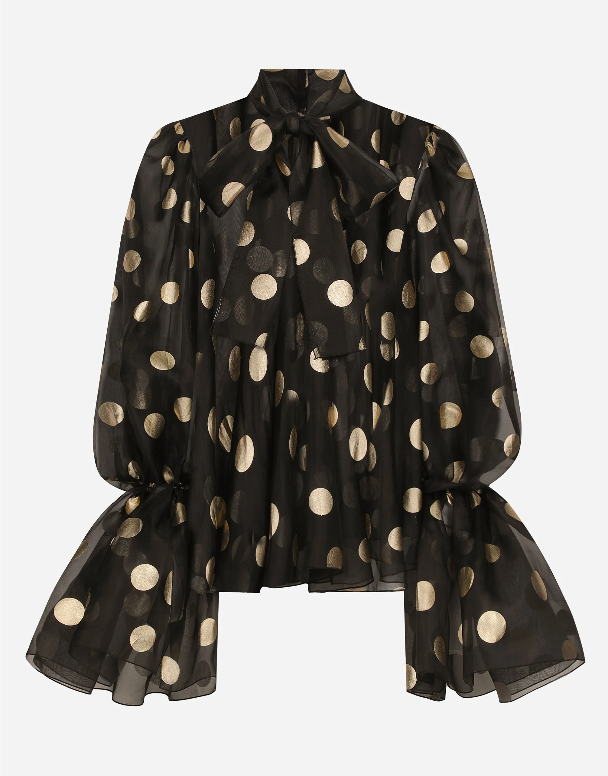 Menswear and womenswear mix and mingle, influencing one another and creating tailoring that embraces endless nuances, from the boldest to the most sophisticated, to define the rules of eternally classy femininity. A monochrome retelling in Nero Sicilia black, embellished by golden touches and rhinestones, adorning clean lines and incorporating stylish fabrics such as velvet, chiffon, lace, organza, and unique mesh details, the expression of authentic beauty for dresses, shirts and accessories. Silk organza jacquard blouse with lame polka-dot design and pussy-bow: • Black • Round neck with scarf that can be tied into a bow • Long sleeves • Stretch cuffs with ruffles • Unlined • Small press-stud fastenings on the back of the neck • The piece measures 66.5 cm from the center back on a size IT 40 • The model is 175 cm tall and wears a size IT 40 • Made in Italy External composition: 100% Silk