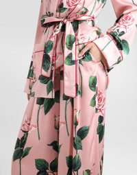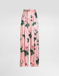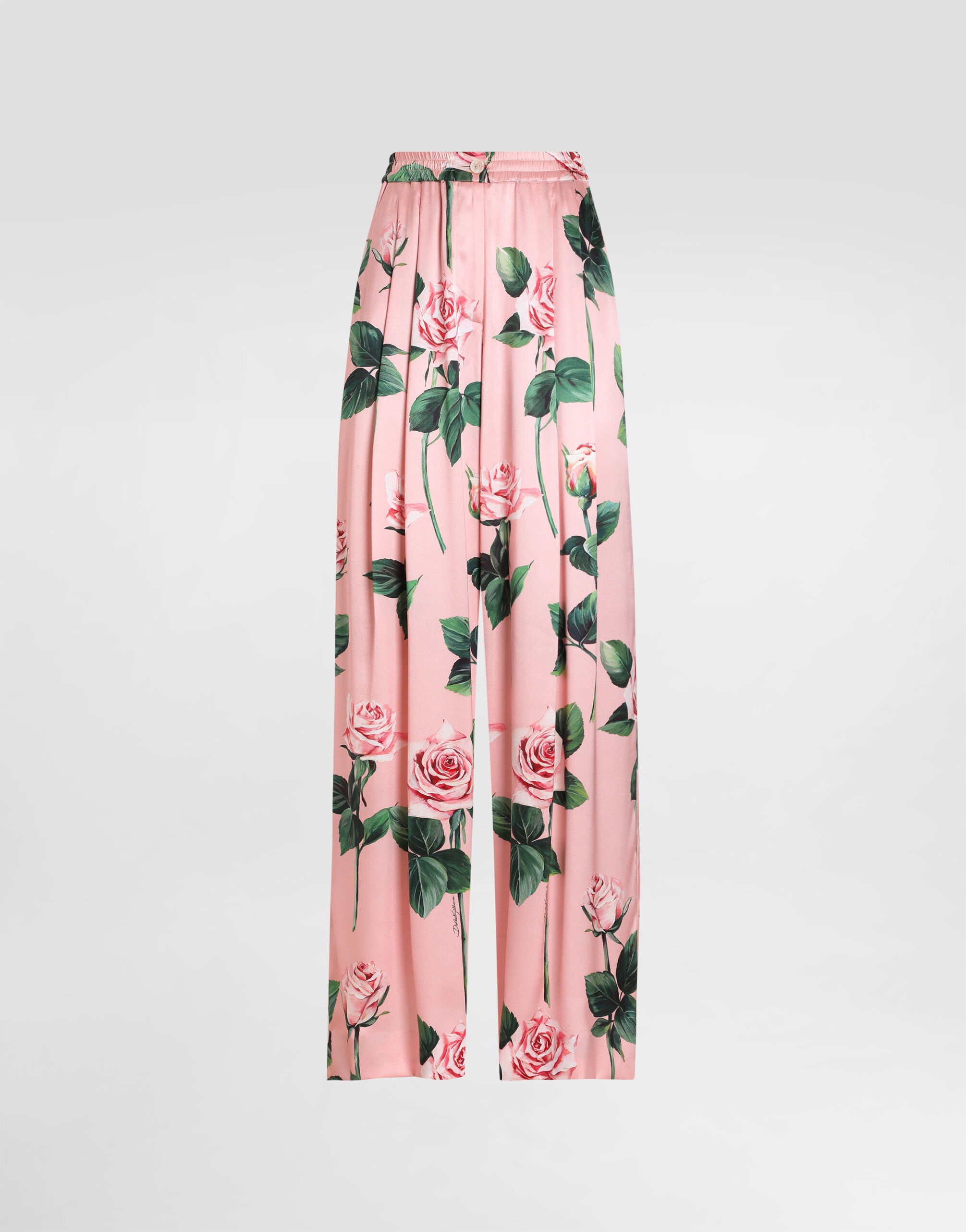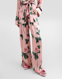 The Spring/Summer 2025 Warm Weather Collection is a vibrant ode to the beauty of the floral world, celebrating the elegance and vitality that lie at the heart of the brand’s DNA. Delicate, colorful bouquets dance across light dresses, skirts, trousers, and beachwear, infusing each piece with a sense of romance and freshness. Coordinated accessories, from scarves to headbands, add charm. An explosion of color and blooms, this collection captures the brand’s unmistakable spirit. Stretch silk satin pajama pants with rose print: • Multi-colored • Stretch Dolce high waist • Front slant pockets • Faux fly on the center front • Inner leg: 77 cm • Hem: 30.4 cm • The model is 175 cm tall and wears a size IT 40 • Made in Italy The difference in the print placement that you may find on this product is a feature of Dolce&Gabbana’s “Handmade” pieces. A detail that makes every garment or accessory unique and exclusive. External composition: 93% Silk 07% Spandex