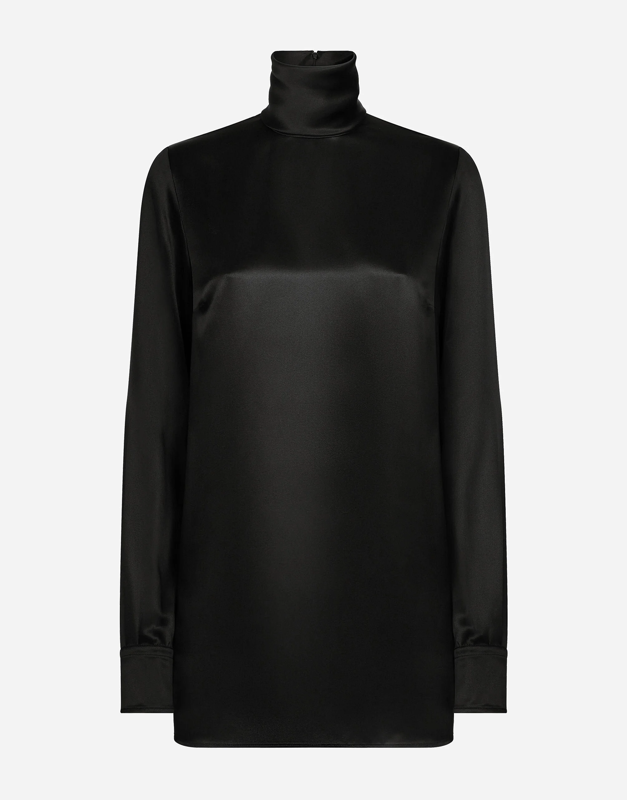Menswear and womenswear mix and mingle, influencing one another and creating tailoring that embraces endless nuances, from the boldest to the most sophisticated, to define the rules of eternally classy femininity. A monochrome retelling in Nero Sicilia black, embellished by golden touches and rhinestones, adorning clean lines and incorporating stylish fabrics such as velvet, chiffon, lace, organza, and unique mesh details, the expression of authentic beauty for dresses, shirts and accessories. Silk satin blouse: • Black • High neck • Long sleeves • Shirt-style cuffs • Unlined • Zipper on the back of the neck • The piece measures 75 cm from the center back on a size IT 40 • The model is 175 cm tall and wears a size IT 40 • Made in Italy External composition: 100% Silk