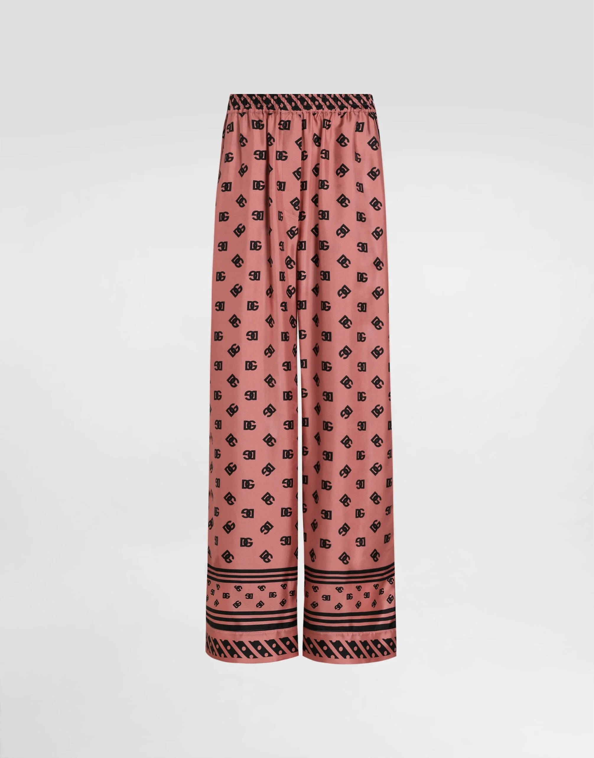 The Women’s DNA Collection is introducing a new side to femininity, which comes in shades of rose quartz, poised between sheerness and opacity, lightness and structure, formality and sensuality. Geometric Dolce Jackets, jacquard pajamas and floral brocade dresses intertwine with ultra-romantic designs. The DG print becomes an iconic statement, while Cordonetto lace and hints of Sicily Black embody the essence of a determined yet romantic femininity. Silk satin jacquard pajama pants with all-over DG logo: • Pink • Stretch Dolce high waist • Front slant pockets • Faux fly on the center front • Inner leg: 77 cm • Hem: 30.4 cm • The model is 175 cm tall and wears a size IT 40 • Made in Italy External composition: 100% Silk