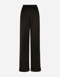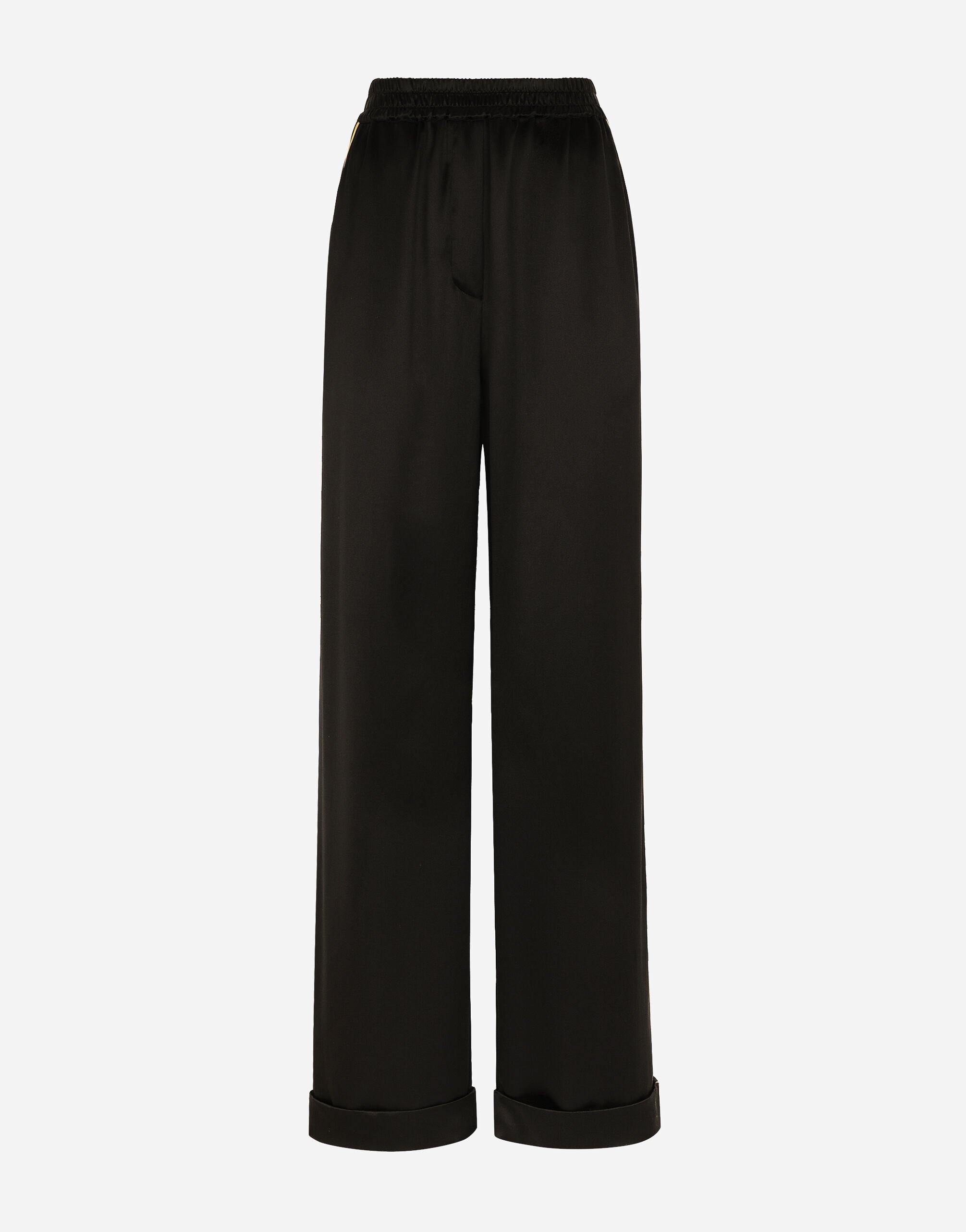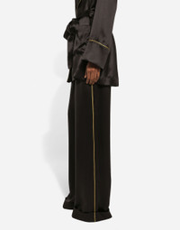 The Holiday collection is an extraordinary story that brings together two worlds: Dolce&Gabbana and the great stars from Hollywood’s Golden Age, who were recognized and admired for their wonderful dresses and extraordinarily glamorous looks. The designers are reinventing and making us dream in front of tailored pieces with breathtaking elegance and visual impact, a sparkling mood that will give everyone a modern, recognizable and unique allure on any occasion. Silk satin pajama pants: • Black • Stretch waist with elasticated back • Front slant pockets • Contrasting piping • Faux fly • Inner leg: 80 cm • Hem: 30 cm • The model is 175 cm tall and wears a size IT 40 • Made in Italy External composition: 100% Silk Internal composition: 100% Silk