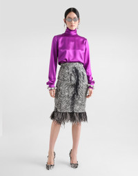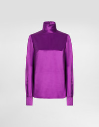 The Everyday Women's Collection reimagines contemporary daily wear with Dolce&Gabbana's signature style codes. Iconic fabrics mix with standout details like embroidered flowers, crystals, and jewel buttons, infusing elegance into every look. Gray animal print accented with green and purple, hyper-geometric jewelry, voluminous shapes and transparencies add unique touches. Men's tweed is reinvented with graphic twists, creating distinctive pieces that reflect refined sensuality. Silk satin sack top with turtle-neck: • Purple • High neck • Long sleeves • Regular fit • Zipper on center back of neck • The piece measures 65 cm from the center back on a size IT 40 • The model is 175 cm tall and wears a size IT 40 • Made in Italy External composition: 100% Silk