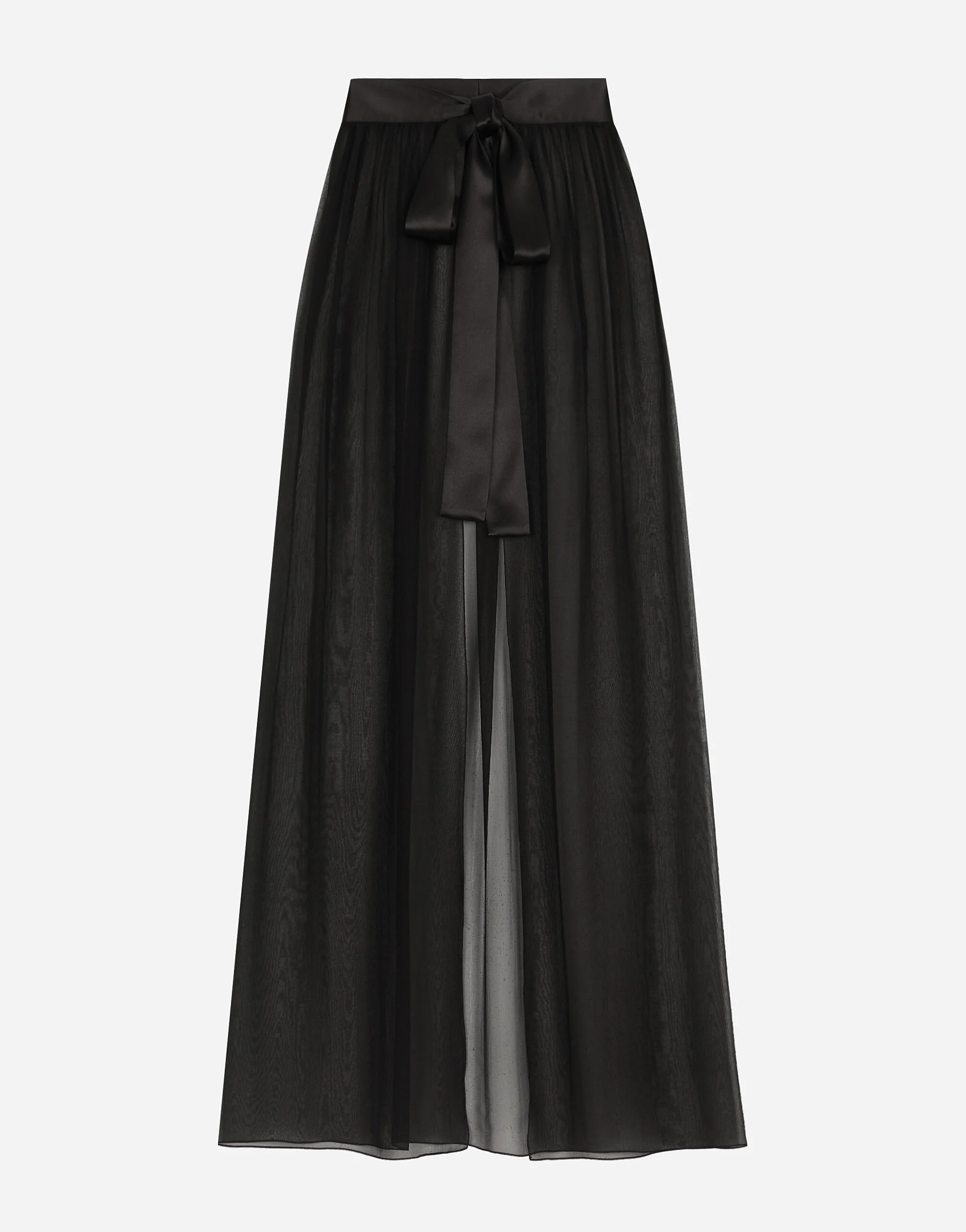 Menswear and womenswear mix and mingle, influencing one another and creating tailoring that embraces endless nuances, from the boldest to the most sophisticated, to define the rules of eternally classy femininity. A monochrome retelling in Nero Sicilia black, embellished by golden touches and rhinestones, adorning clean lines and incorporating stylish fabrics such as velvet, chiffon, lace, organza, and unique mesh details, the expression of authentic beauty for dresses, shirts and accessories. Long silk chiffon skirt with belt: • Black • Adjustable waist • Unlined • Tie fastening with satin belt • The piece measures 110 cm from the waist down on a size IT 40 • The model is 175 cm tall and wears a size IT 40 • Made in Italy External composition: 100% Silk