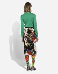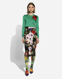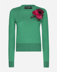 The spirit of the 1960s is taking over the new Flower Power collection. The focus is a head-to-toe floral look built around pairing and layering rose, anemone and floral bouquet maxi-prints. A cosmopolite poised between playful and sexy, this woman interprets the austerity and elegance of the 1960s, harking back to boldly opulent imagery that here at Dolce&Gabbana is condensed and reinterpreted through silhouettes, ample proportions and airy shapes, bringing femininity and sensuality to the forefront. Silk sweater with flower appliqué: • Green • 18-gauge knit • Round neck • Regular fit • Fine-rib trims • The piece measures 55 cm from the shoulder seam on a size IT 40 • The model is 175 cm tall and wears a size IT 40 • Made in Italy External composition: 100% Silk
