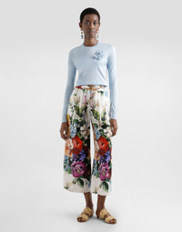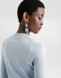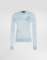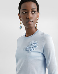 This silk pullover is a women's wardrobe essential, combining elegance and comfort in a timeless design. Perfect for any occasion, its light blue color adds a touch of freshness, while the silk workmanship and the flower brooch give it a discreet elegance. Silk pullover with flower brooch: • Light blue • Crew neck • Long sleeves • Bottom width 60 cm on size 40 IT • The model is 175 cm tall and wears size 40 IT • Made in Italy External Composition: 100% Silk