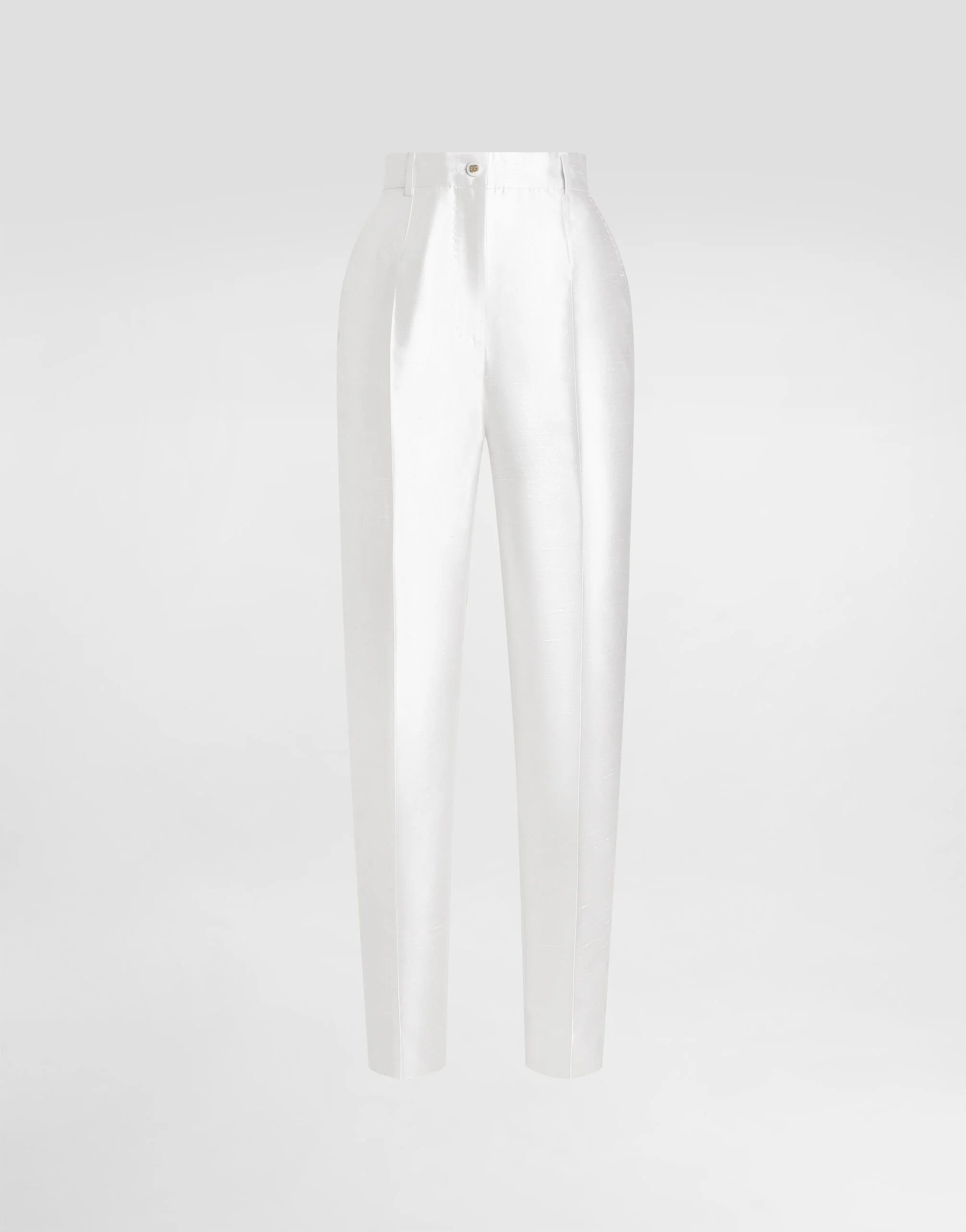 These classic trousers are a must-have for those looking for elegance and sophistication. Perfect for any occasion, they stand out for their cigarette line and fine fabric. Silk trousers: • White • Cigarette line • Dolce waist with external and internal belt in adhesive fabric • Center back length 74 cm on size 40 IT • The model is 175 cm tall and wears size 40 IT • Made in Italy External Composition: 100% Silk