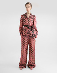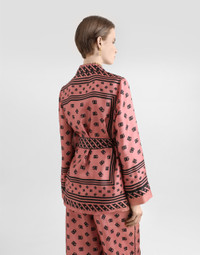 The Women’s DNA Collection is introducing a new side to femininity, which comes in shades of rose quartz, poised between sheerness and opacity, lightness and structure, formality and sensuality. Geometric Dolce Jackets, jacquard pajamas and floral brocade dresses intertwine with ultra-romantic designs. The DG print becomes an iconic statement, while Cordonetto lace and hints of Sicily Black embody the essence of a determined yet romantic femininity. Silk twill pajama shirt with all-over DG logo scarf print: • Pink • Notched lapel collar • Long sleeves • Patch pockets • Regular fit • Button fastenings with branded bottom edge and silk belt • The piece measures 75 cm from the back of the neck on a size IT 40 • The model is 175 cm tall and wears a size IT 40 • Made in Italy External composition: 100% Silk
