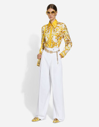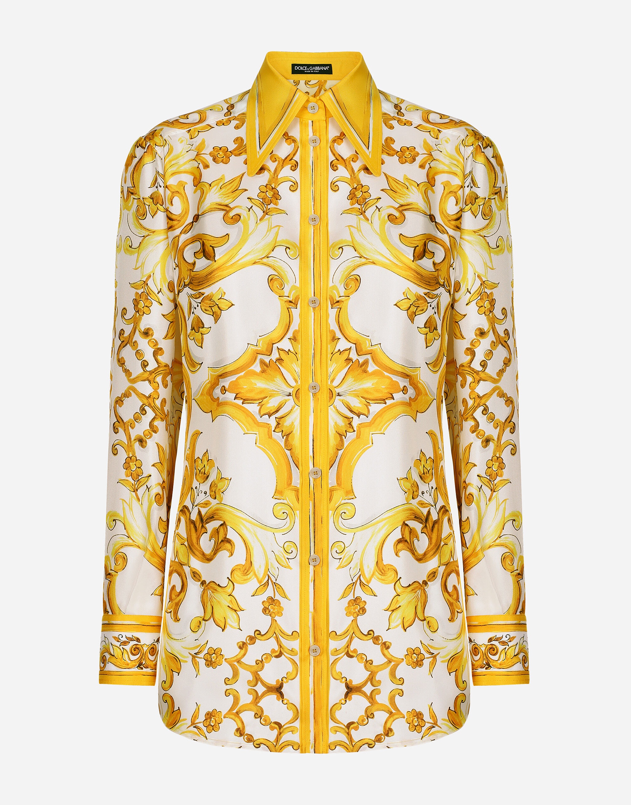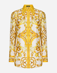 The Majolica, a symbol of Italian craftsmanship, comes in lemon yellow for the FW24/25 Girl’s Collection. This vibrant hue, brightened up by pure white, evokes summer light dancing on the quintessential Sicilian homes that look out to the sea. Evocative color detailing that adds a bold edge to iconic accessories and pieces that are extraordinarily feminine and vibrant. A tribute to the majolica art that, once again, enhances Dolce&Gabbana aesthetic rules. Silk twill shirt with majolica print: • White and Yellow • Shirt collar • Long sleeves • Regular fit • Button fastenings • The piece measures 75 cm from the center back on a size IT 40 • The model is 175 cm tall and wears a size IT 40 • Made in Italy External composition: 100% Silk