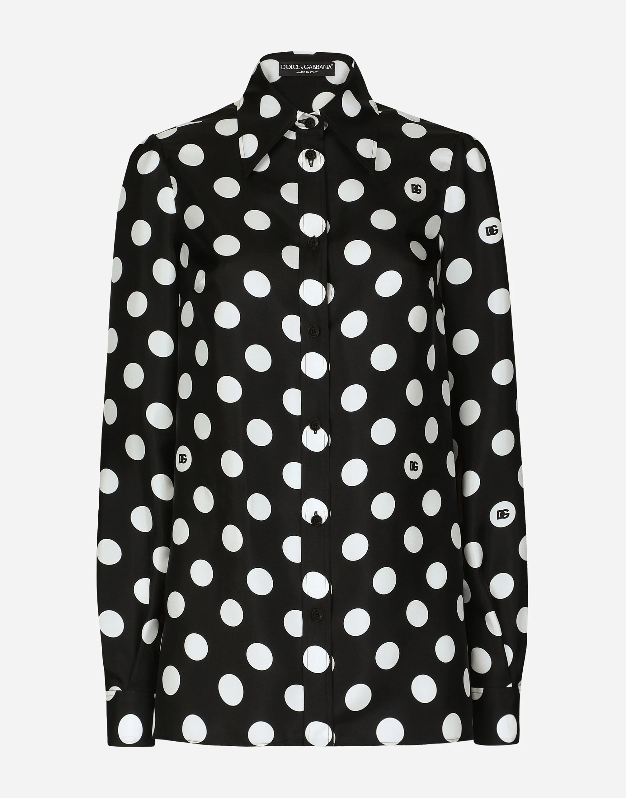 The FW24/25 Mambo Collection is rewriting the rules of Italian elegance, merging the sophisticated style of the 1940s and 1950s with the iconography of American pin-ups. The unmistakable polka-dot motif takes center stage, coming in a variety of shapes and sizes and adorning tulle, charmeuse, twill, silk and poplin, giving life to looks distinguished by black and white accessories and details. An homage to the beauty of Italy and its traditions, the distinctive details of Dolce&Gabbana’s creations. Silk twill shirt with polka-dot print: • Black and White • Shirt collar • Long sleeves • Regular fit • Button fastenings • The piece measures 70 cm from the back of the neck on a size IT 40 • The model is 175 cm tall and wears a size IT 40 • Made in Italy The difference in the print placement that you may find on this product is a feature of Dolce&Gabbana’s “Handmade” pieces. A detail that makes every garment or accessory unique and exclusive. External composition: 100% Silk