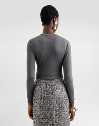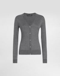 The Everyday Women's Collection reimagines contemporary daily wear with Dolce&Gabbana's signature style codes. Iconic fabrics mix with standout details like embroidered flowers, crystals, and jewel buttons, infusing elegance into every look. Gray animal print accented with green and purple, hyper-geometric jewelry, voluminous shapes and transparencies add unique touches. Men's tweed is reinvented with graphic twists, creating distinctive pieces that reflect refined sensuality. Silk V-neck cardigan with DG logo embroidery: • Gray • 18-gauge knit • V-neckline • Long sleeves • French seam armholes • Ribbed neck and hem • Regular fit • Button fastenings • The piece measures 60 cm from the shoulder seam on a size IT 40 • The model is 175 cm tall and wears a size IT 40 • Made in Italy External composition: 100% Silk