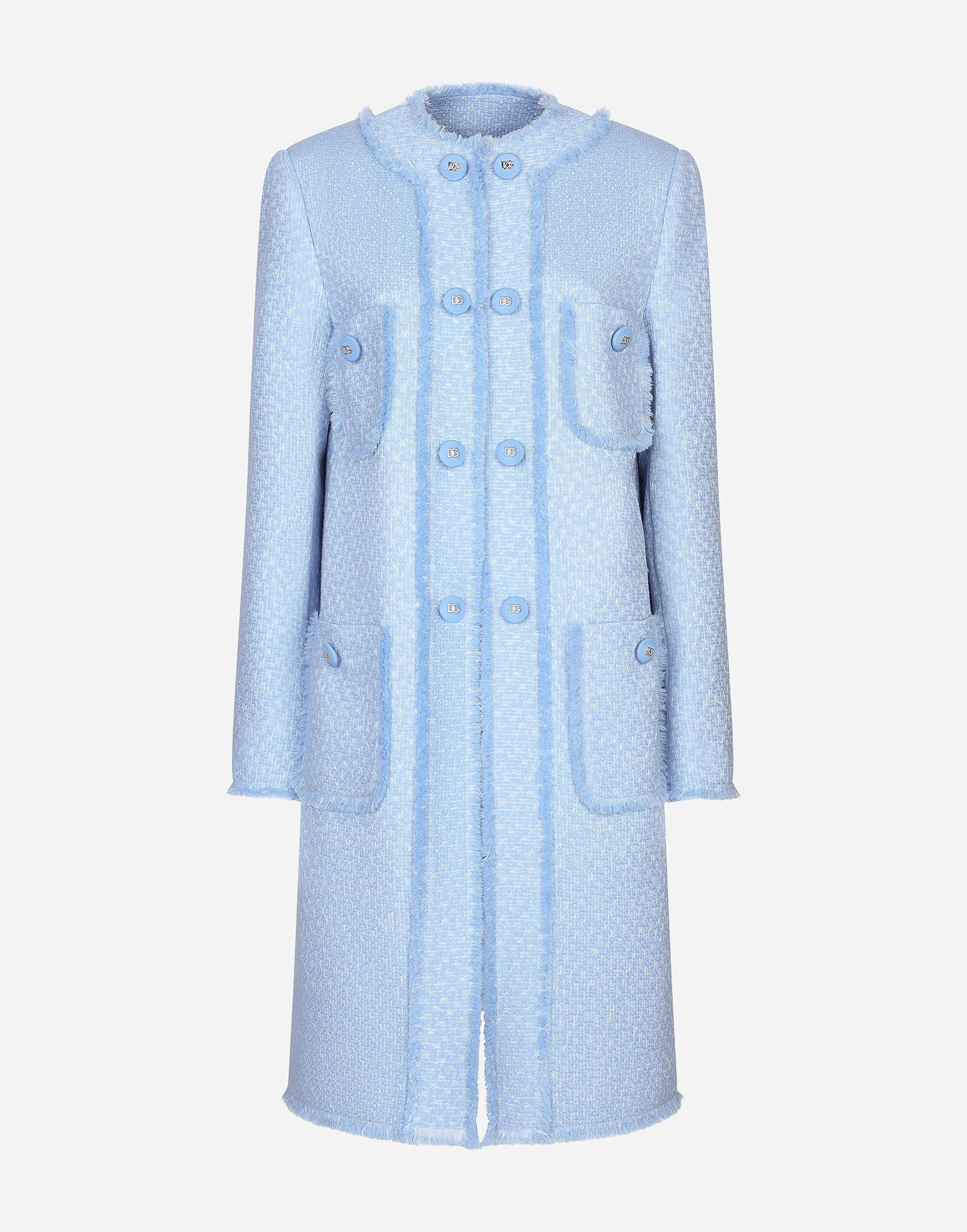In the FW 24/25 DNA Collection, the rules of classic tailoring have been reworked with an innovative feel. New raschel weave techniques feature on micro-jackets and coats, and original textures are woven on trench coats, skirts, jacquard suits and shirts. The color palette made up of Nero Sicilia black, Milky White and Ocean Blue is also original. The iconic bags in fine nappa leather and “Pyton FC Machine” finish off the looks. Raschel wool tweed coat: • Light blue • Round neck • Long sleeves • Patch pockets with decorative metal DG-logo buttons on the exterior • Tonal stretch silk satin lining • Hook-and-eye fastenings • The piece measures 100 cm from the center back on a size IT 40 • The model is 175 cm tall and wears a size IT 40 • Made in Italy External composition: 67% Virgin Wool 27% Viscose 06% Polyamide Internal composition: 92% Silk 08% Spandex