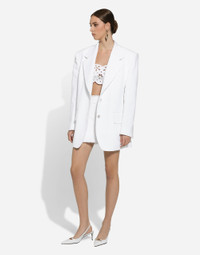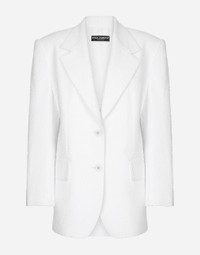 The Italian summers of the 1960s, the candid purity of white, the sophisticated elegance of the jet set of that era. The imagery of the FW24/25 Capri Collection encapsulates all this flawlessly. The pieces range from floaty poplin silhouettes or sack-style dresses and skirts, to brocade outerwear and floral-inlay fabric shirts. The iconic bags – the Logo Bag, the Sicily Bag and the Dolce Box – complement the looks, while the shoes come embroidered with designs inspired by the crystal-clear sea of Capri. Single-breasted cotton raschel tweed jacket: • White • Notched lapel collar • Long sleeves • Silk satin lining • Mother-of-pearl-effect button fastenings • The piece measures 78 cm from the center back on a size IT 40 • The model is 175 cm tall and wears a size IT 40 • Made in Italy External composition: 80% Cotton 15% Linen 05% Polyamide Internal composition: 100% Silk