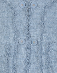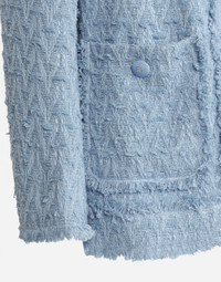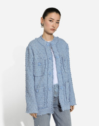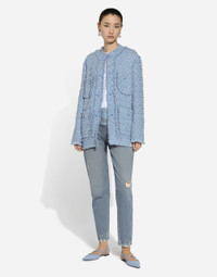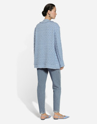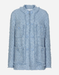 In the FW 24/25 DNA Collection, the rules of classic tailoring have been reworked with an innovative feel. New raschel weave techniques feature on micro-jackets and coats, and original textures are woven on trench coats, skirts, jacquard suits and shirts. The color palette made up of Nero Sicilia black, Milky White and Ocean Blue is also original. The iconic bags in fine nappa leather and “Pyton FC Machine” finish off the looks, as well as the Muns shoes inspired by the Global Ambassador, Mun KaYoung. Single-breasted cotton rush-stitch jacket: • Light blue • Round neck • Long sleeves • Patch pockets with decorative metal buttons with the DG logo • Tonal stretch silk satin lining • Hook-and-eye fastenings on the front • The piece measures 72 cm from the center back on a size IT 40 • The model is 175 cm tall and wears a size IT 40 • Made in Italy External composition: 67% Cotton 28% Viscose 04% Linen 01% Polyamide Internal composition: 92% Silk 08% Spandex