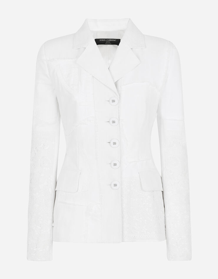 Single-breasted denim and lace patchwork jacket