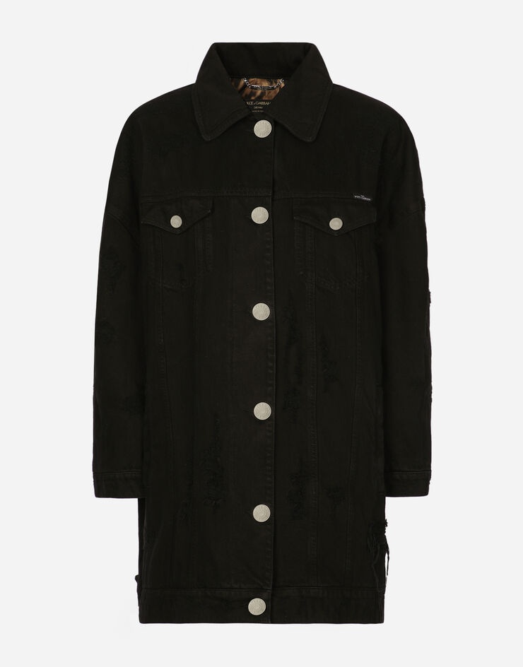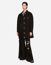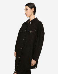 Long denim jacket with metal “Kim Dolce&Gabbana” tag: • Shirt collar • Long sleeves • Flap pockets • Leopard-print stretch satin lining • Quilted wad padding • “Kim Dolce&Gabbana” label on breast pocket • Branded metal button fastenings • The model is 175 cm tall and wears a size IT 40 • Made in Italy Care And Details External composition: 98% Cotton 2% Spandex Internal composition: 97% Polyester 3% Spandex