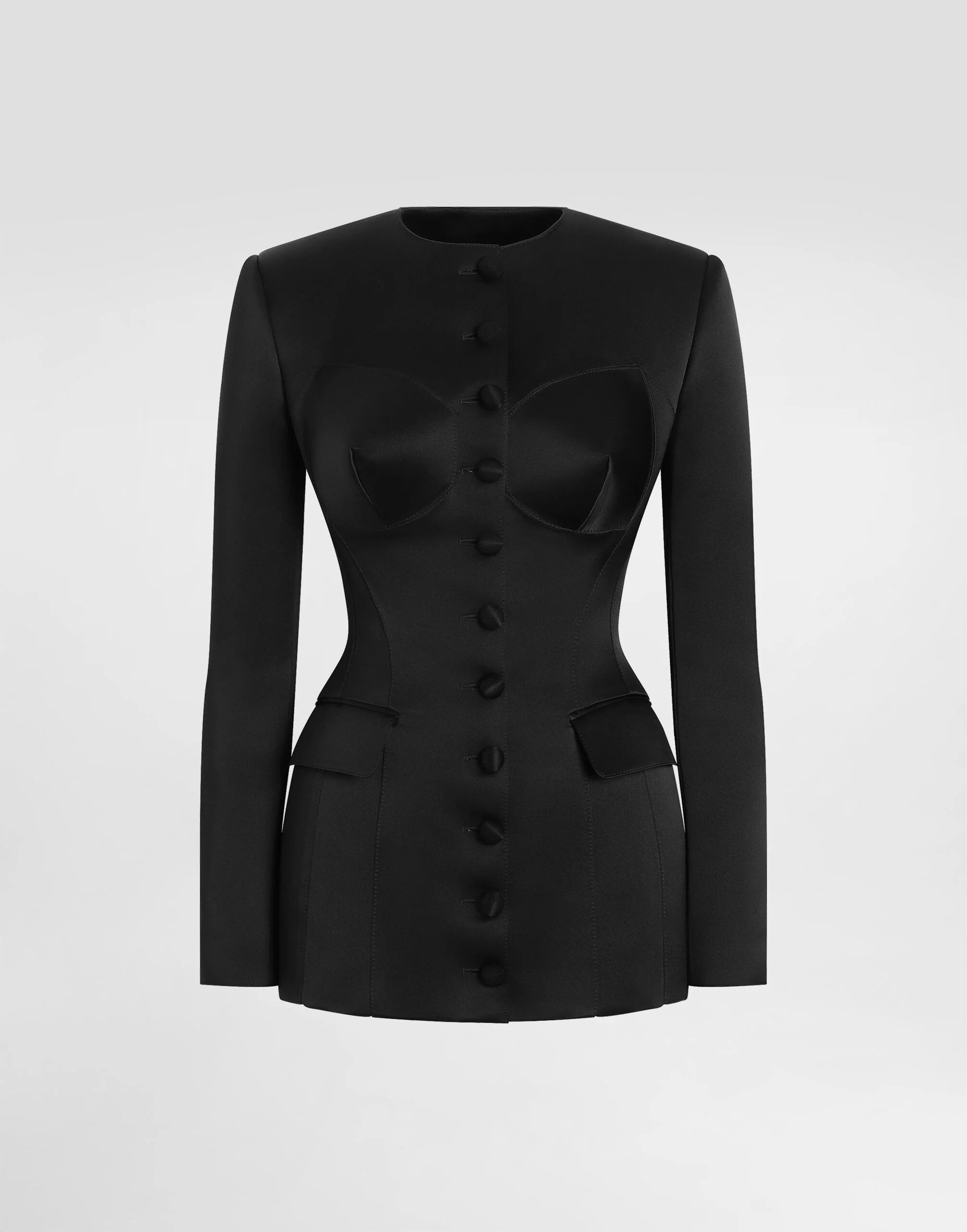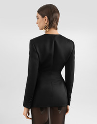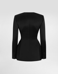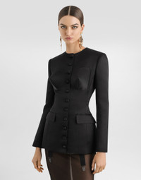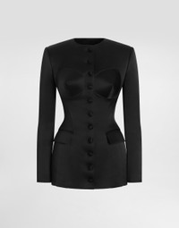 The Spring/Summer 2025 Women’s Collection is celebrating Italian beauty through bold and charismatic femininity. The 50s-inspired lingerie is the star, intermingling with fitted dresses, corsets and oversize trench coats. The iconic jackets have been updated with cropped cuts and modern inserts, while the floral prints add a romantic edge. The eveningwear shines with light fabrics and crystals, accompanied by look-defining accessories, from iconic bags to the cross earrings. Single-breasted duchess jacket with conical cups: • Black • Round neck • Long sleeves • Flap pockets • Stretch silk satin lining • Button fastenings • The piece measures 68.5 cm from the center back on a size IT 40 • The model is 175 cm tall and wears a size IT 40 • Made in Italy External composition: 100% Silk Internal composition: 92% Silk 8% Spandex