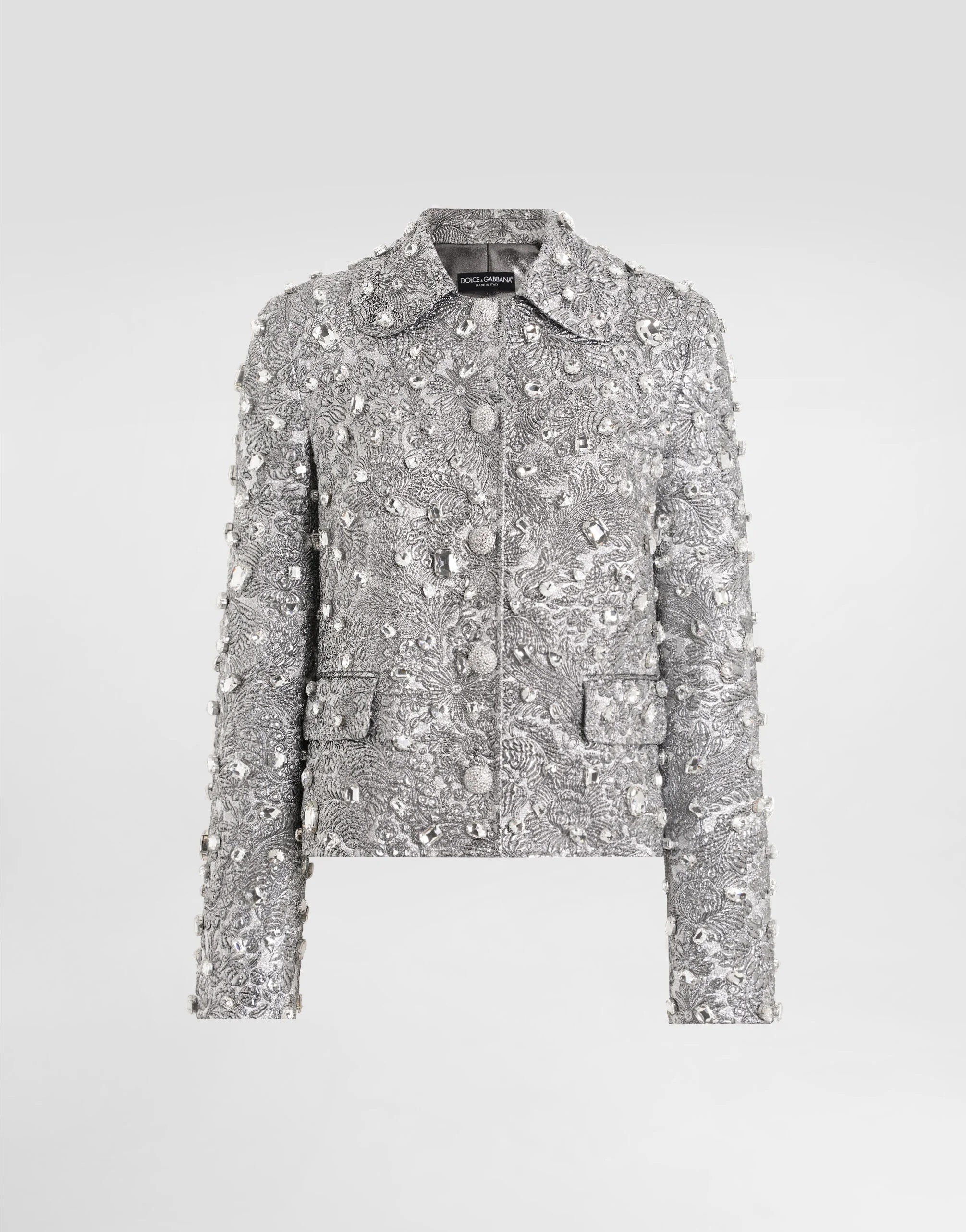 Elegance, tailored lines and sparkling details define the Dolce&Gabbana Holiday collection. Sixties inspirations blend with a contemporary aesthetic. For him, structured jackets and cuts that enhance the silhouette for her, silver brocade and crystals illuminate festive looks. Each piece stands out for its fine materials, attention to detail and distinctive style. This jacket represents the elegance and sophistication of a tailored garment. Perfect for those looking for a refined and original touch, it is ideal for completing a sophisticated and fashionable look. Single-breasted embroidered jacket with stones: • Multi-colored • Baby collar with double sail and double bezel • Long sleeves • Poussoir and jewel buttons closure • Lined • Length from shoulder is 55 cm on size 40 IT • Made in Italy External composition: 33% Metallic Polyester, 32% Acrylic, 16% Virgin Wool, 13% Silk, 6% Polyamide Internal composition: 94% Polyester, 6% Elastane