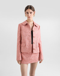 Single-breasted floral quilted jacquard Gabbana jacket with DG logo: • Pink • Baby collar • Long sleeves • Silk satin lining • Cannete-covered button fastenings and DG logo • The piece measures 55.5 cm from the rear collar seam on a size IT 40 • The model is 175 cm tall and wears a size IT 40 • Made in Italy External composition: 49% Cotton 32% Polyester 19% Silk Internal composition: 100% Silk