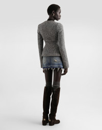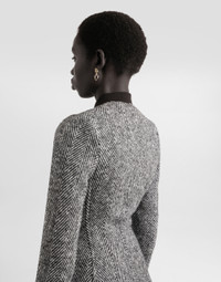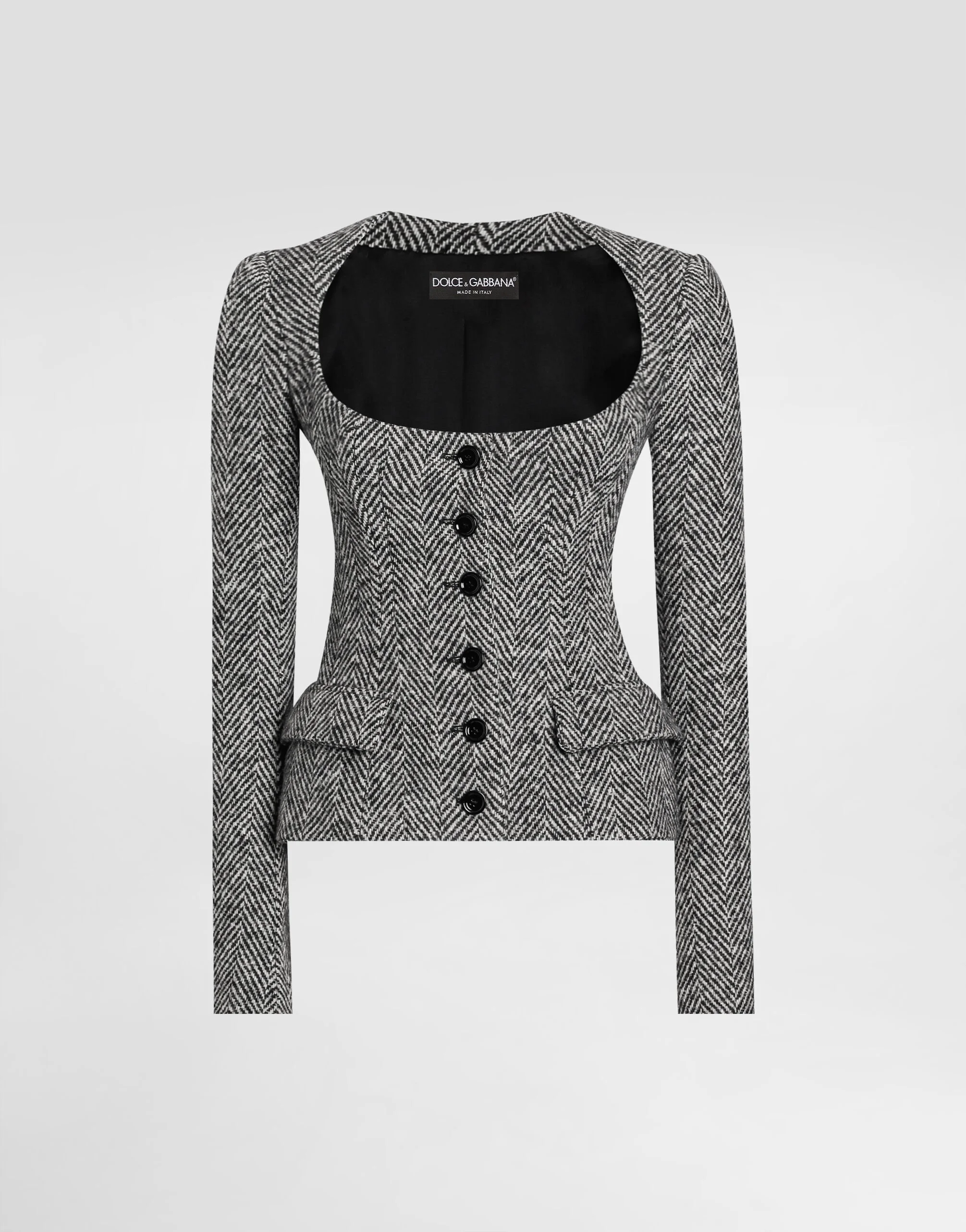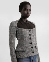 This single-breasted jacket is perfect for those looking for a touch of elegance and style. Made of wool chevron, it is a versatile garment that adapts to multiple occasions, always guaranteeing a sophisticated look. Single-breasted jacket in wool chevron: • Multi-colored • Heart-like neckline • With boning • 2-piece sleeves without slit • Lined straps applied to grosgrain waist belt • Lined • The model is 175 cm tall and wears size 40 IT • Made in Italy External Composition: 100% Virgin Wool Internal Composition: 93% Polyester, 7% Elastane