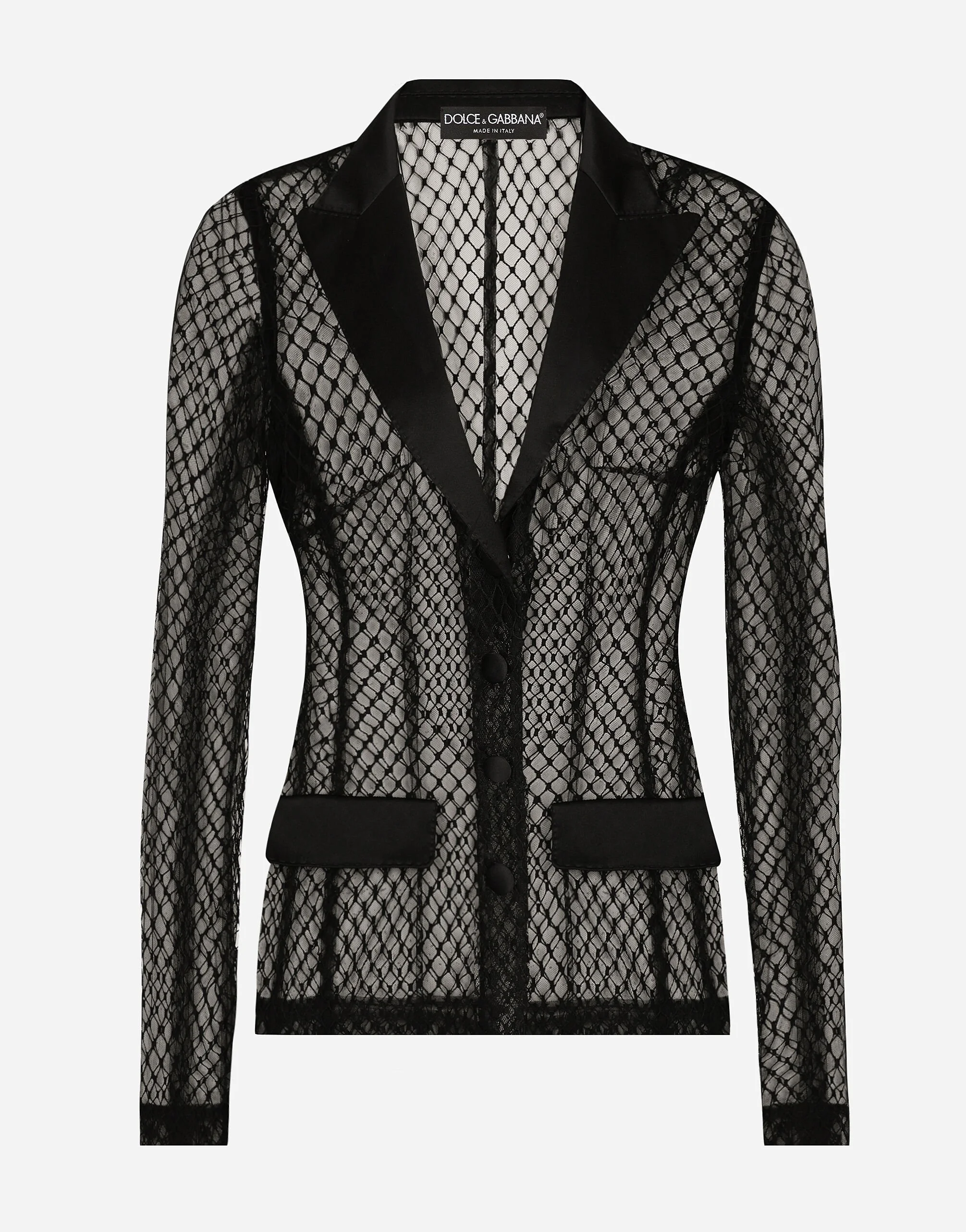 Menswear and womenswear mix and mingle, influencing one another and creating tailoring that embraces endless nuances, from the boldest to the most sophisticated, to define the rules of eternally classy femininity. A monochrome retelling in Nero Sicilia black, embellished by golden touches and rhinestones, adorning clean lines and incorporating stylish fabrics such as velvet, chiffon, lace, organza, and unique mesh details, the expression of authentic beauty for dresses, shirts and accessories. Cotton mesh Dolce tuxedo jacket: • Black • Duchesse peak lapels • Long sleeves • Faux flap pockets • Tulle lining • Button fastenings • The piece measures 62 cm from the center back on a size IT 40 • The model is 175 cm tall and wears a size IT 40 • Made in Italy